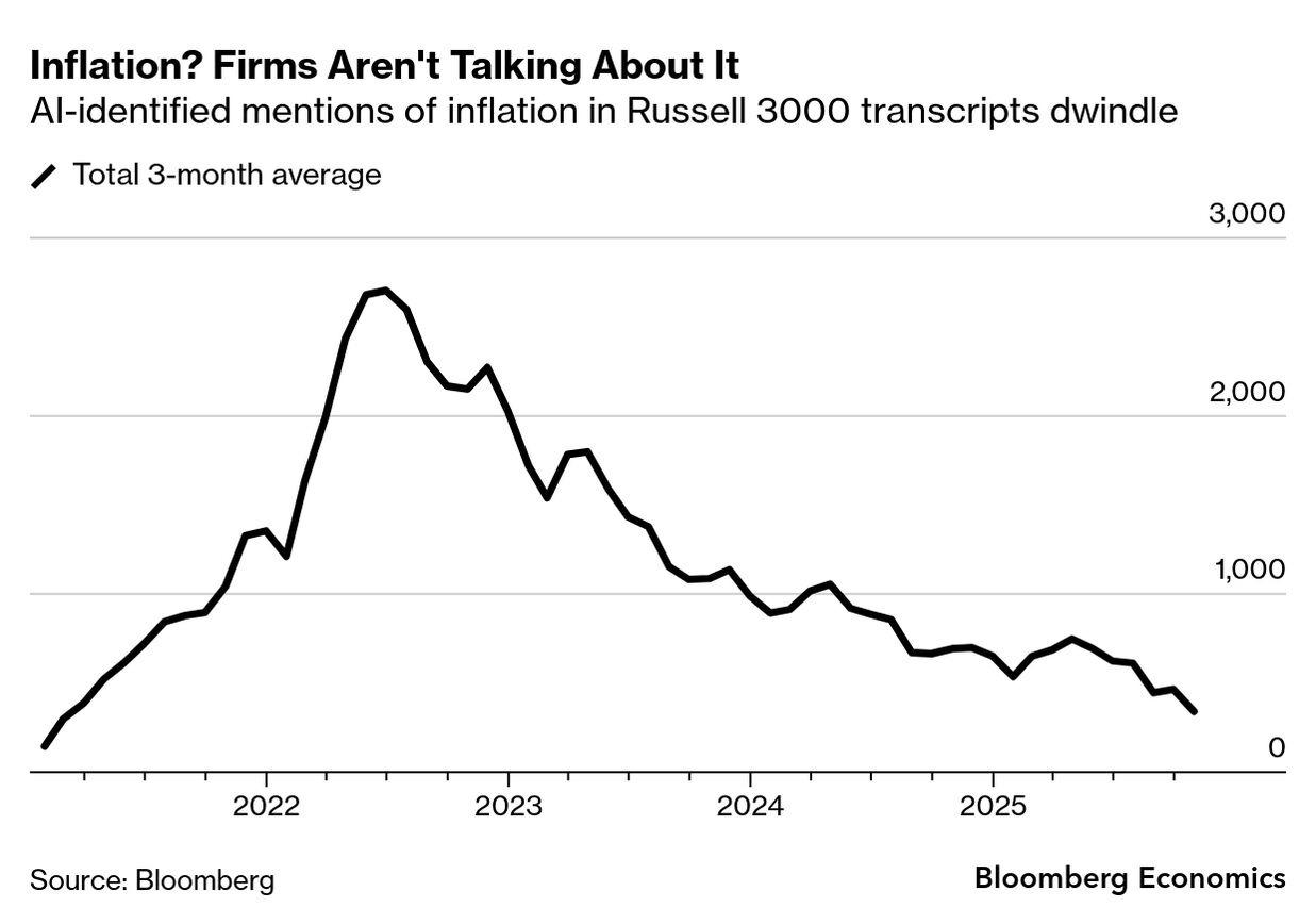 関税が商品価格に影響し始めているという憶測があるにもかかわらず、米国企業はインフレに対してかなり無関心だ ― 少なくとも決算発表における幹部の発言に基づくと。企業説明会で価格やインフレの同義語に言及する割合は、ここ数年で最低水準にまで低下している。