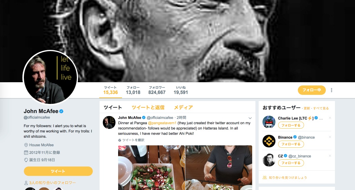 暗号資産(仮想通貨)業界で、相場にかなりの影響をあたえる重要人物、ジョン・マカフィー氏が以下のTweetを発表。