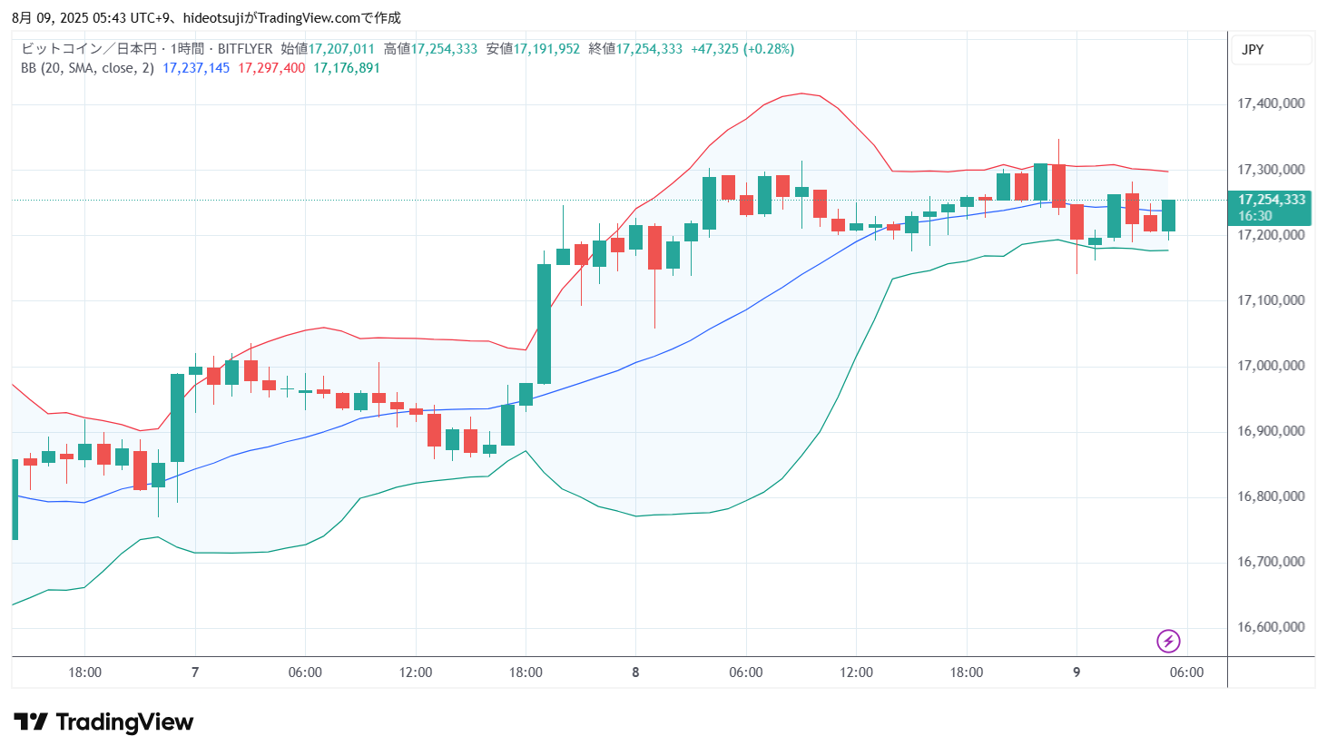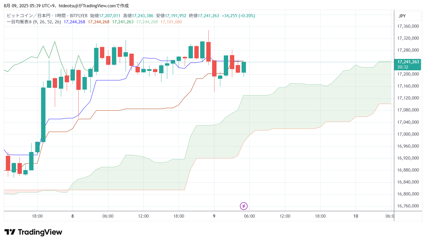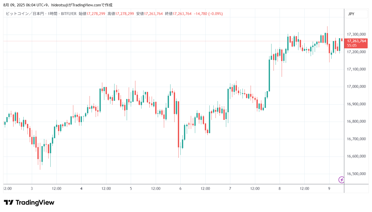 8月9日のビットコインは、始値17,247,092円で寄りついた後、17,247,771円まで上昇したが、17,140,535円まで下落した。その後、17,194,333円まで買い戻された。1時台には17,160,992円まで下落したが、17,195,632円まで買い戻されて上昇した。
