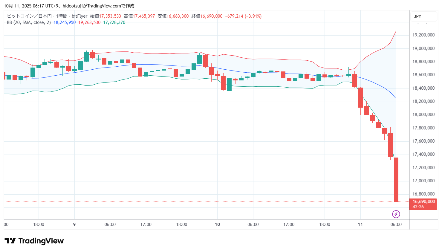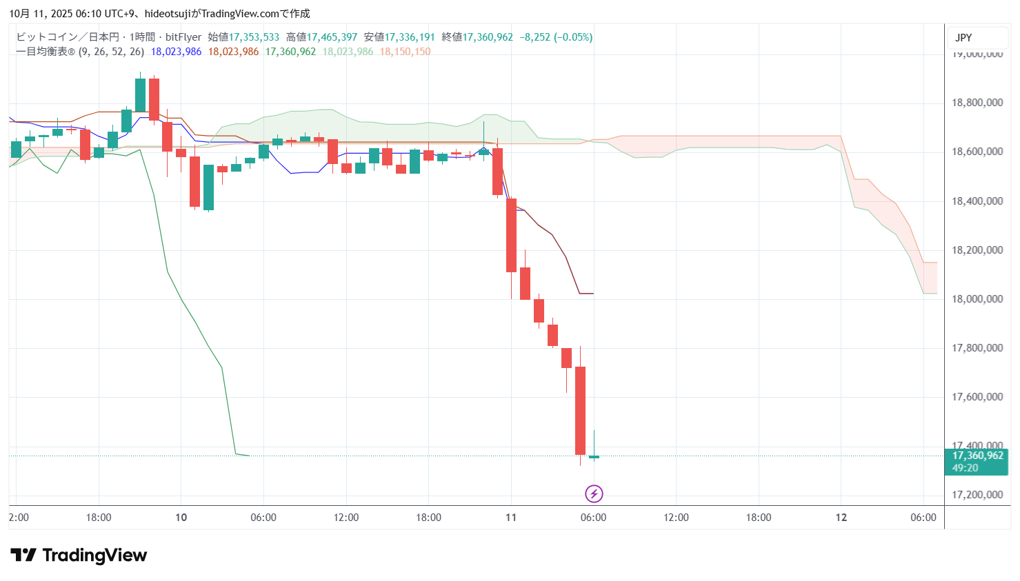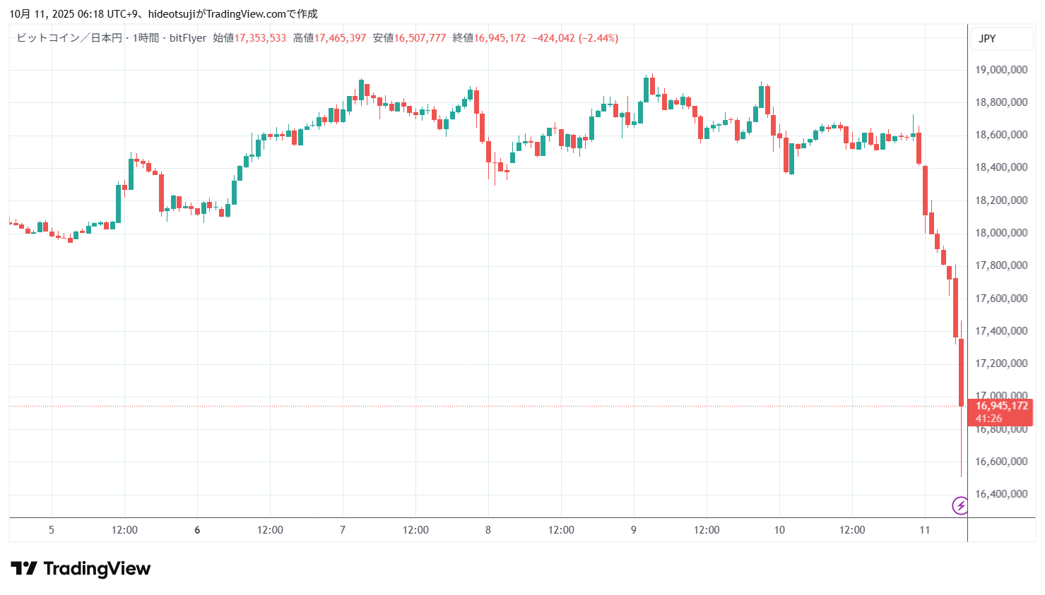 10月11日のビットコインは、始値18,411,000円で寄りついた後、18,419,055円まで上昇したが、18,112,839円まで押し戻されて下落し、5時台は17,320,499円まで下落したが、17,369,214円まで買い戻された。