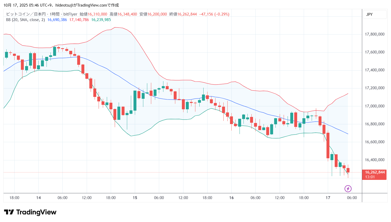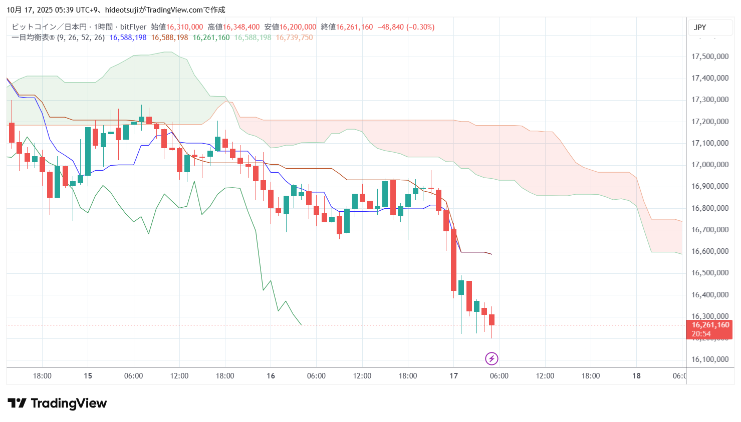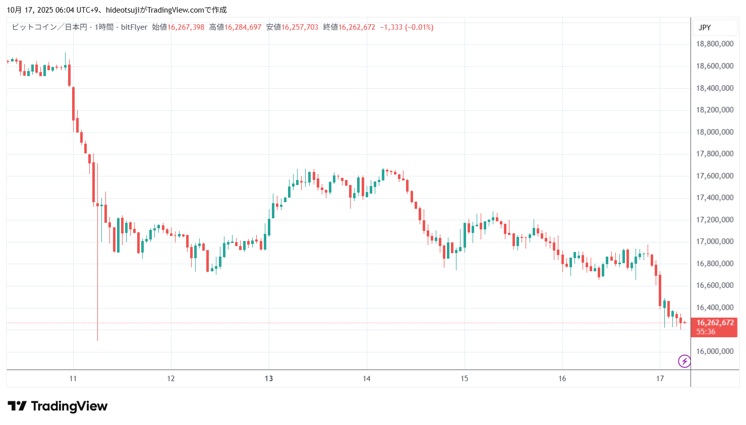 23時台には最安値16,603,900円まで下落したが、買い戻されて、23時59分59秒には終値16,695,820円をつけ、10月16日の取引をひけた。この日1日のビットコインの値動きは最安値最高値ベースで、372,495円であった。