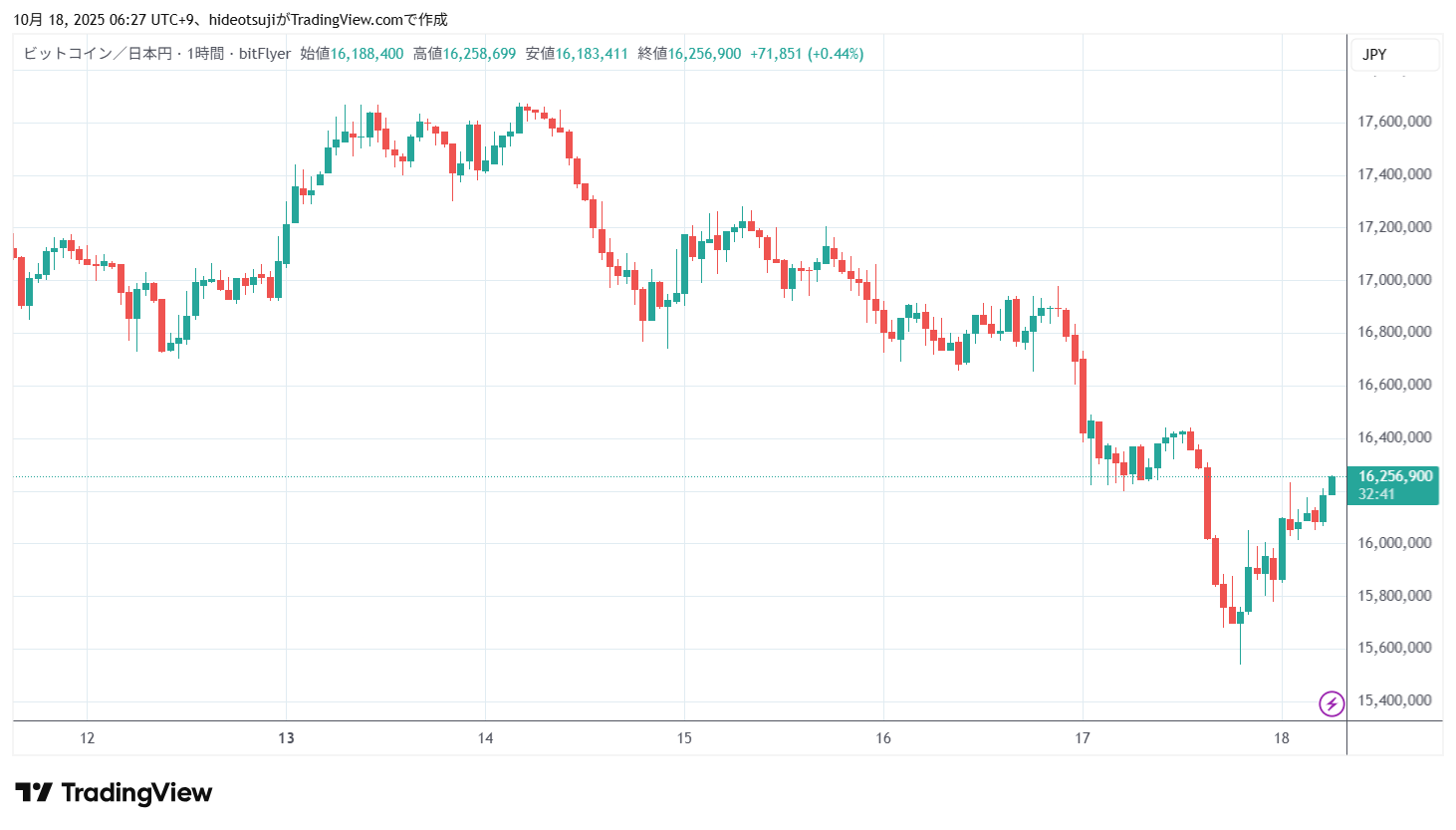 23時台には15,778,000円まで下落したが、買い戻されて、23時59分59秒には終値15,865,900円をつけ、10月17日の取引をひけた。この日1日のビットコインの値動きは最安値最高値ベースで、1,190,844円であった。