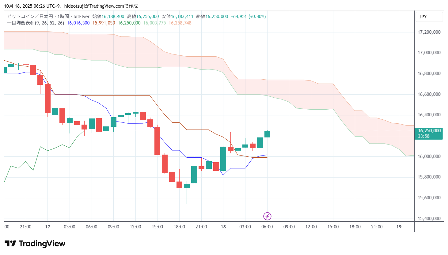 10月18日のビットコインは、始値15,865,900円で寄りついた後、15,850,100円まで下落したが、16,100,000円まで買い戻されて上昇し、1時台には16,233,497円まで上昇したが、16,056,331円まで押し戻されて下落した。