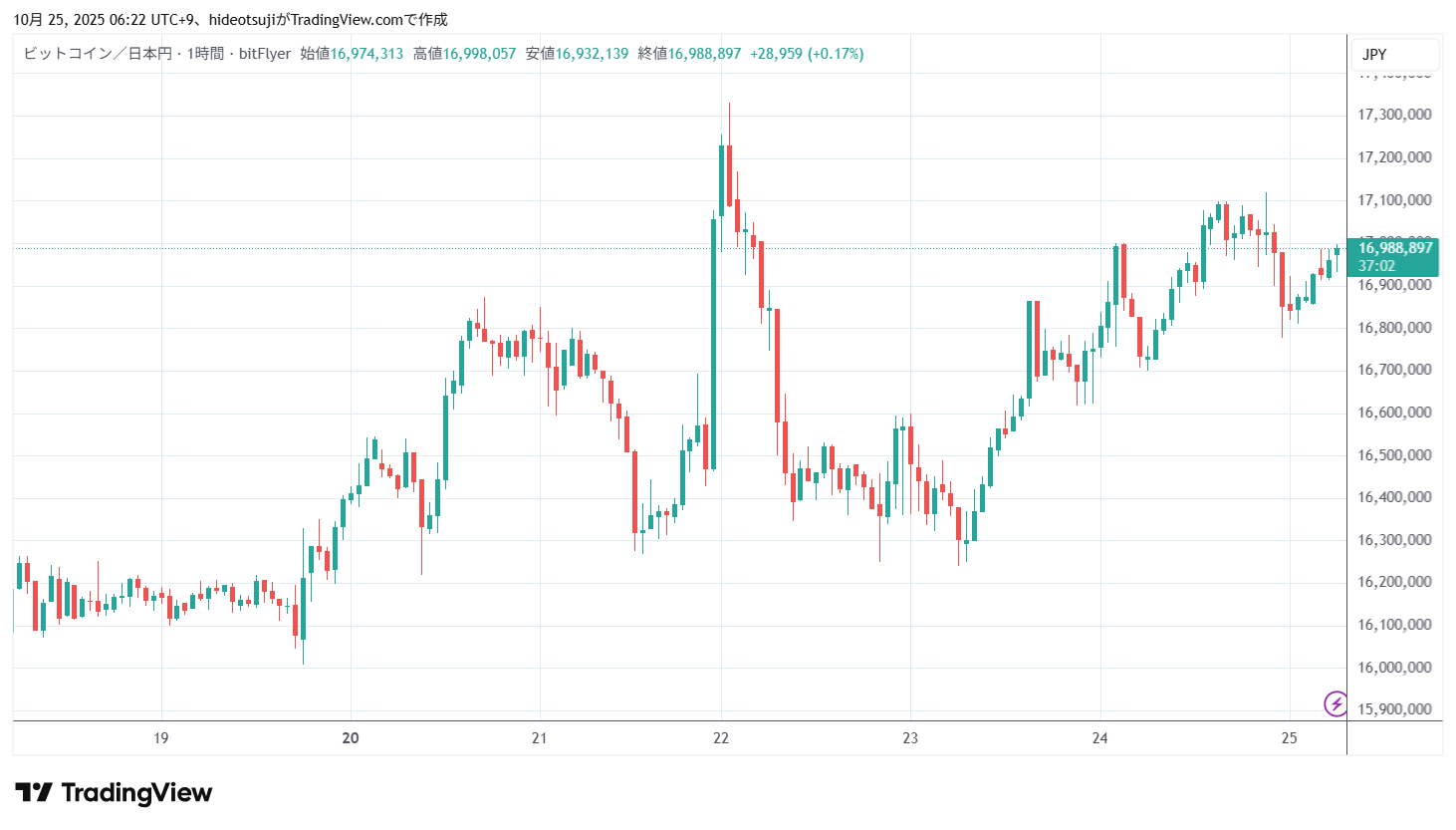 10月25日のビットコインは、始値16,856,098円で寄りついた後、16,922,169円まで上昇したが、16,842,563円まで押し戻されて下落し、1時台には16,810,100円まで下落したが、16,872,500円まで買い戻されて上昇した。