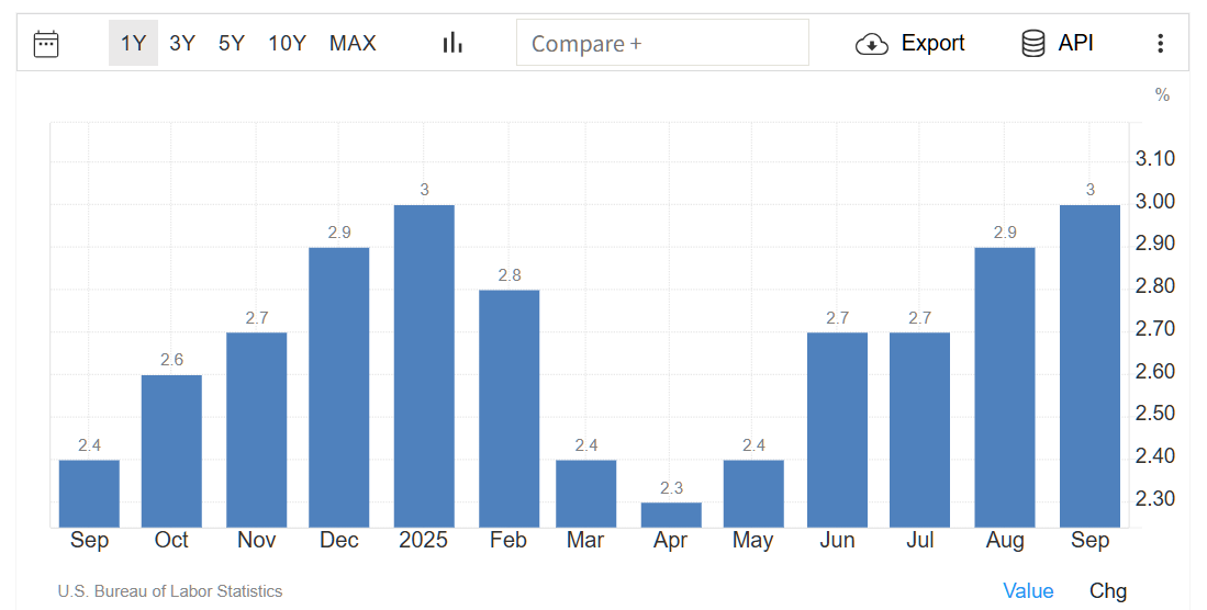 9月のアメリカの消費者物価上昇率は前年同月比3.0%増
