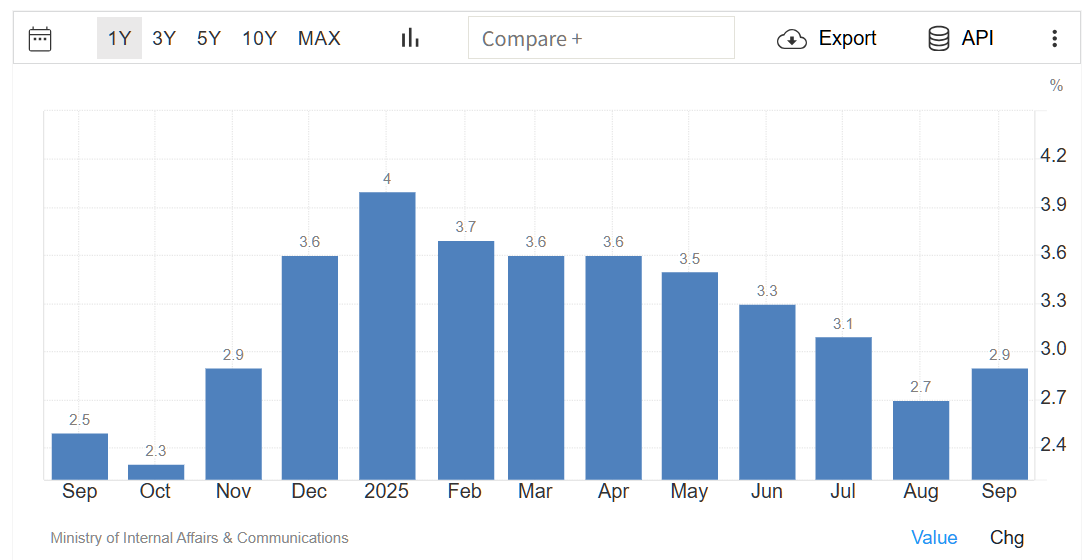 9月の日本の消費者物価上昇率は前年同月比は2.9%増