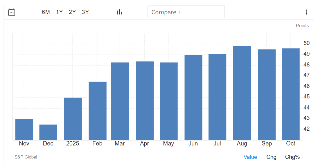 速報値によると、イギリスの10月のS&Pグローバル製造業PMIは、49.6となり、9月の46.2から上昇し、市場コンセンサスの46.6を大きく上回った。この指標は2024年10月以来の最も弱い縮小幅となった。
