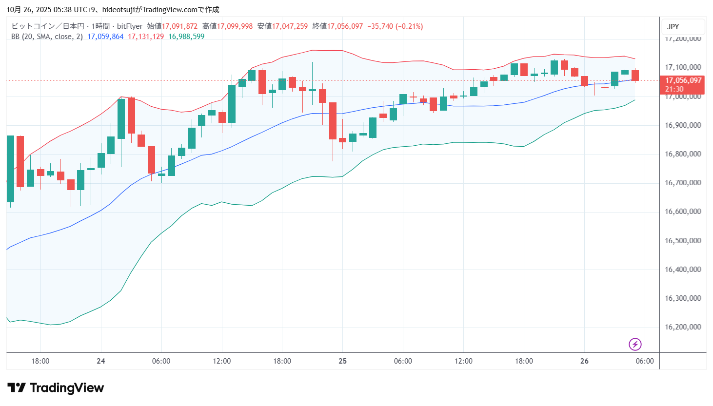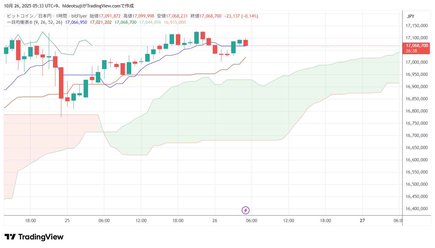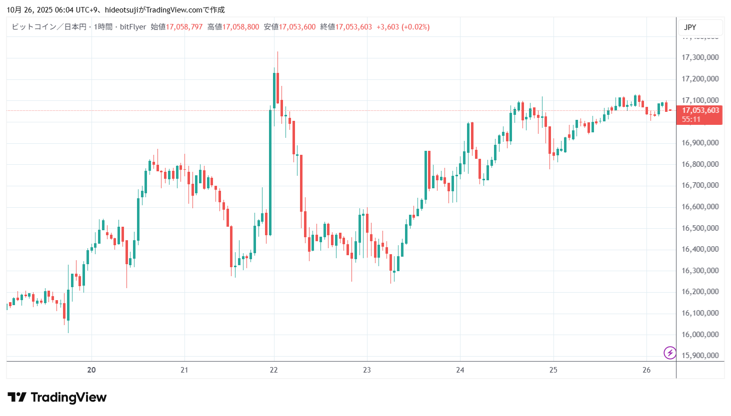 10月26日のビットコインは、始値17,071,500円で寄りついた後下落し、1時台には17,003,900円まで下落したが、17,032,635円まで買い戻されて上昇し、5時台には17,099,998円まで上昇したが、17,050,000円まで押し戻された。