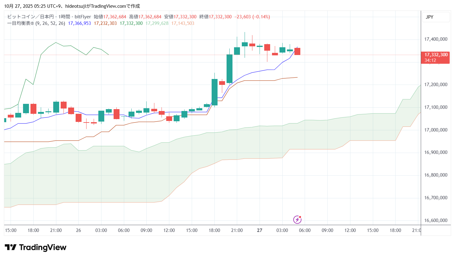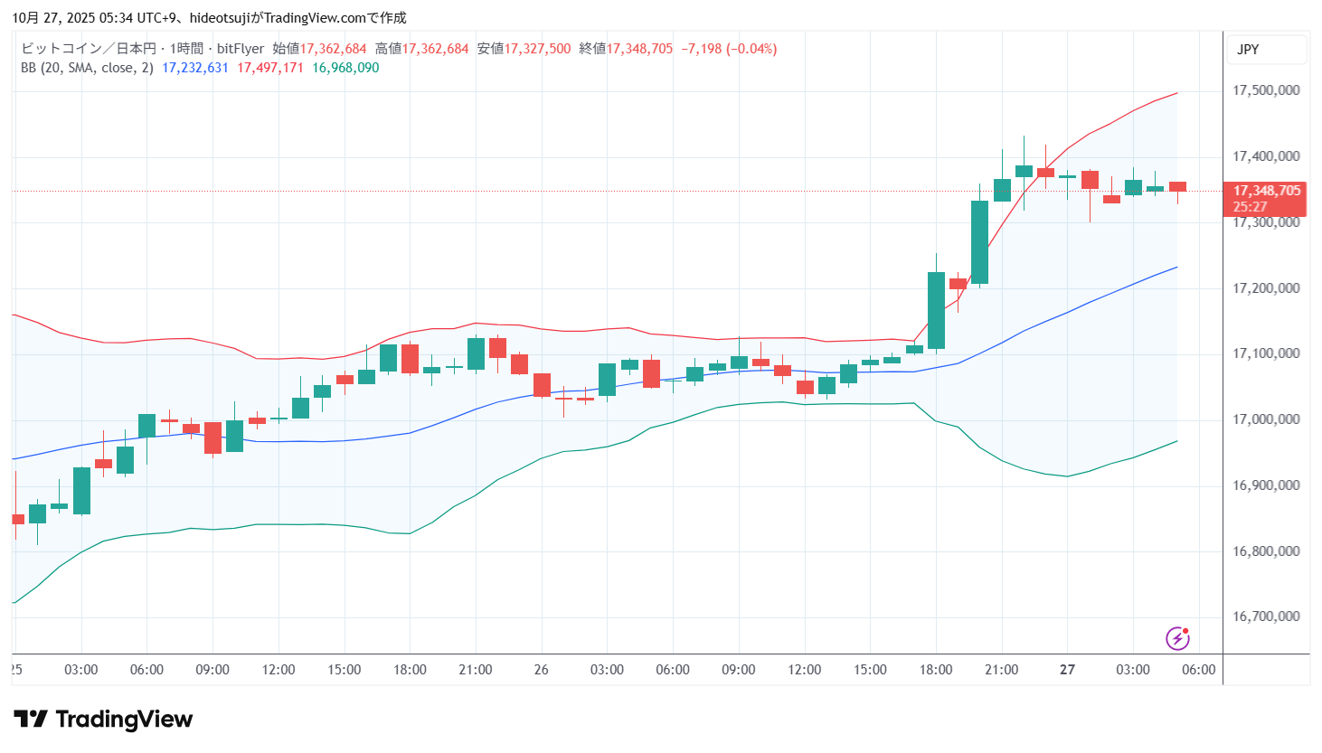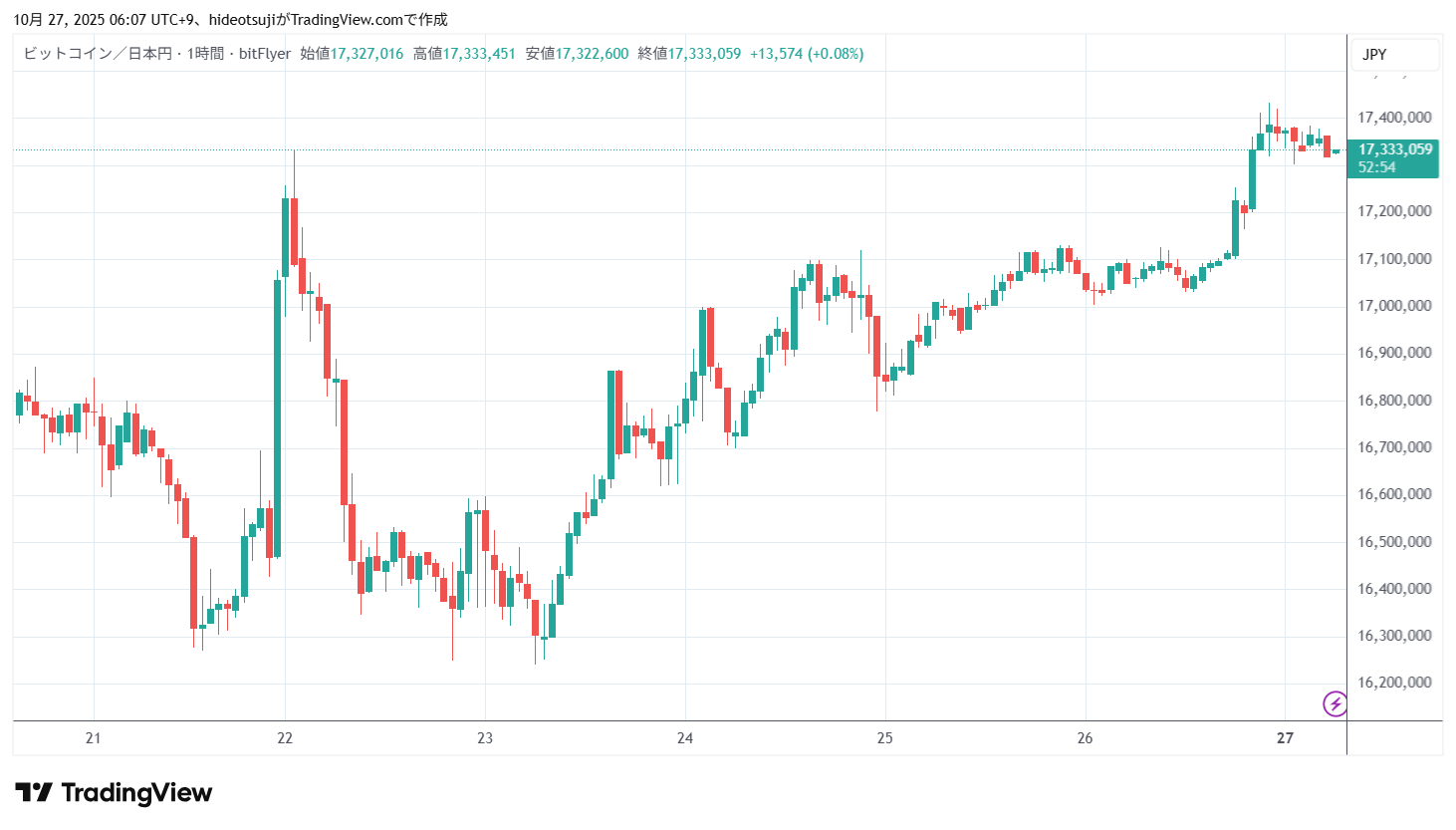 10月27日のビットコインは、始値17,368,830円で寄りついた後、17,334,714円まで下落したが、17,372,458円まで買い戻されて上昇し、1時台には17,382,114円まで上昇したが、17,301,000円まで下落した。その後、17,352,300円まで買い戻されて上昇した。
