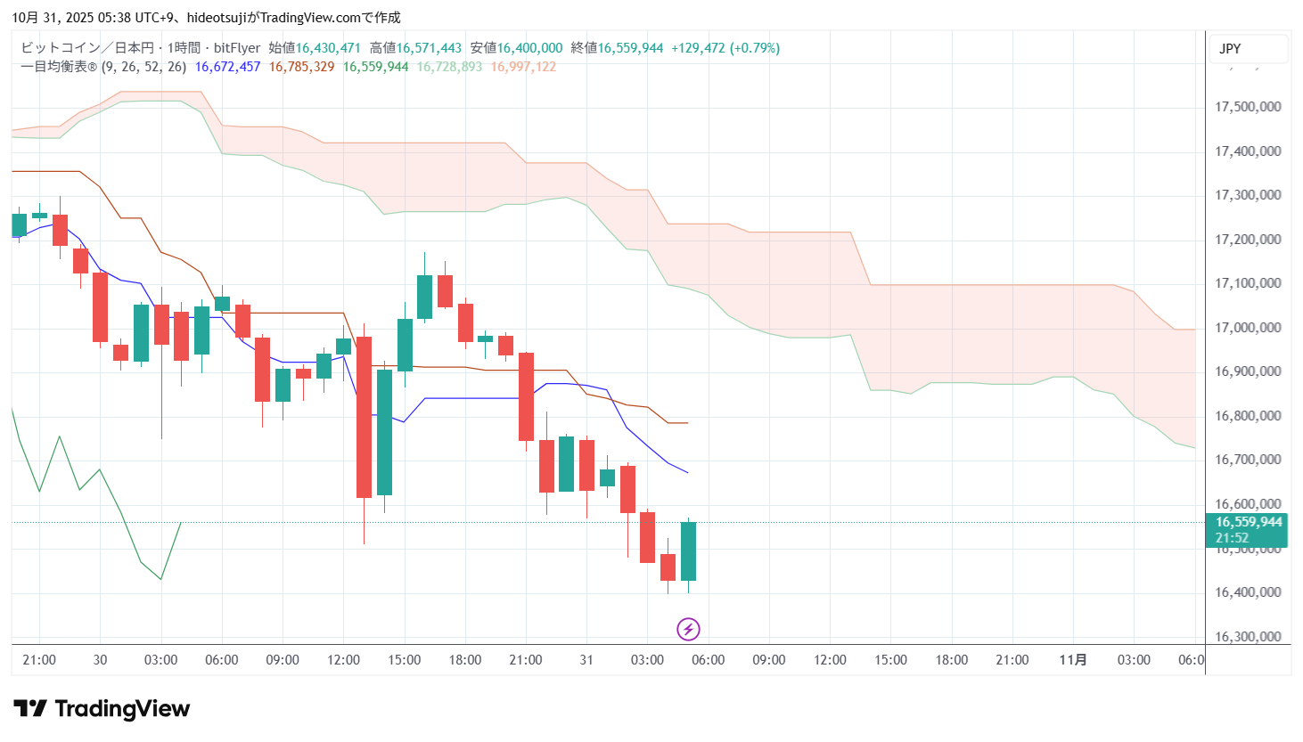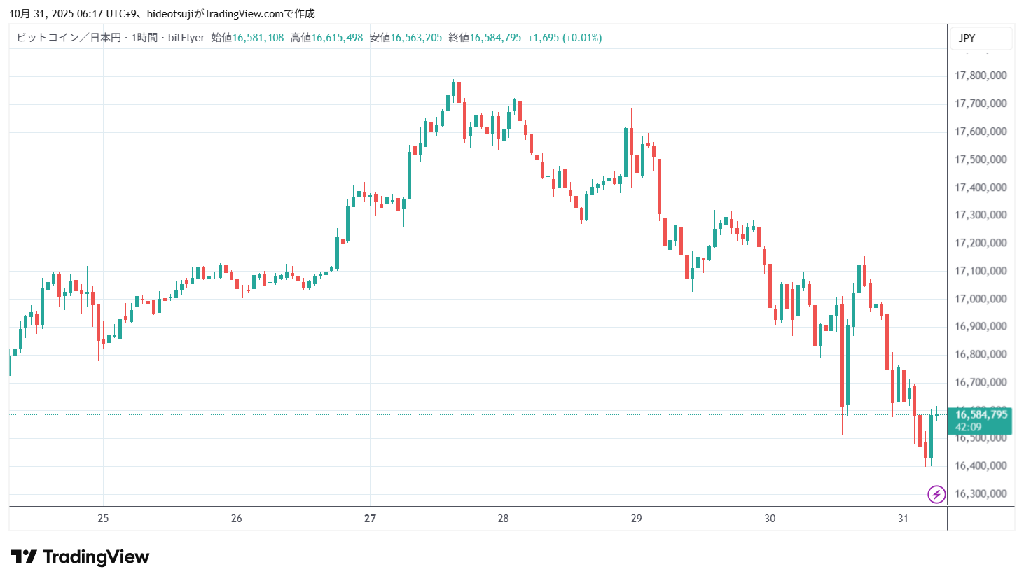 10月31日のビットコインは、始値16,747,439円で寄りついた後、16,756,857円まで上昇したが、16,568,219円まで下落した。その後、16,663,430円まで買い戻されて上昇し、1時台には16,712,599円まで上昇したが、16,680,000円まで押し戻されて下落した。