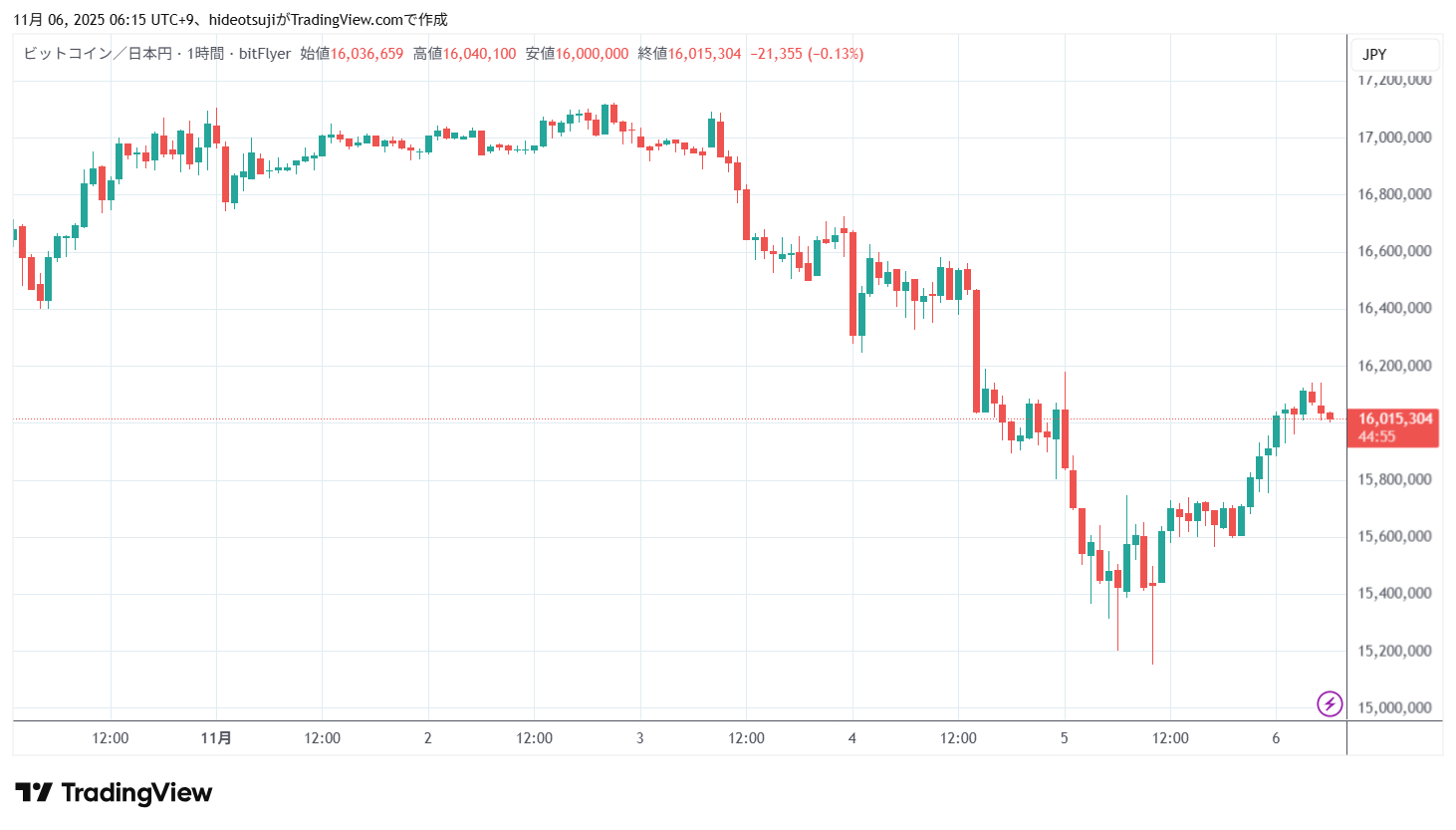 11月6日のビットコインは、始値15,916,194円で寄りついた後、15,883,100円まで下落したが、16,025,387円まで買い戻されて上昇し、5時台には16,140,000円まで上昇したが、16,036,659円まで押し戻された。