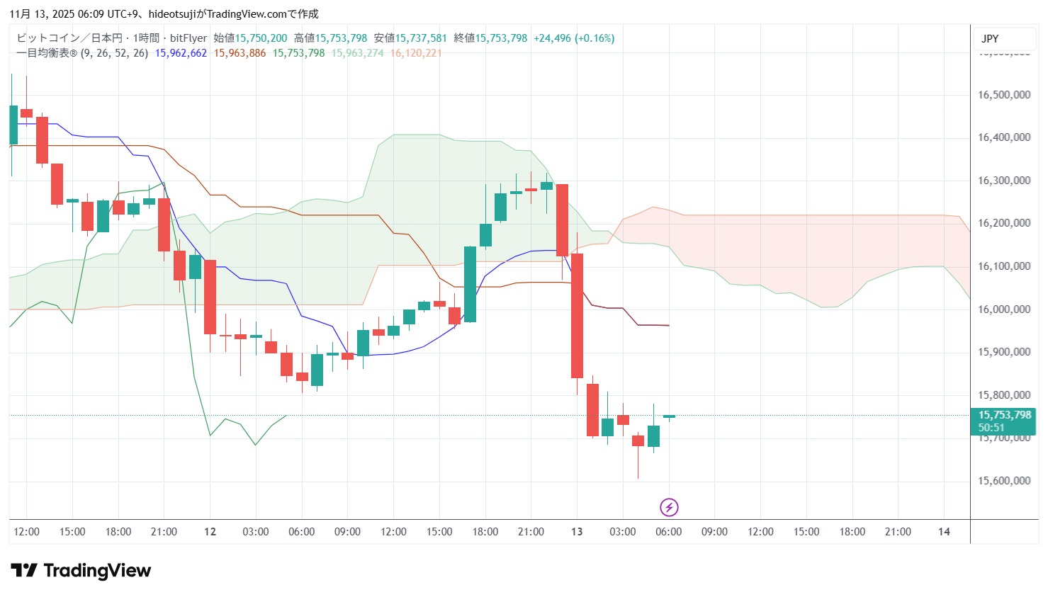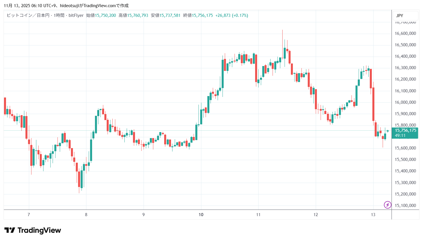 11月13日のビットコインは、始値16,130,291円で寄りついた後、16,180,000円まで上昇したが、15,842,200円まで押し戻されて下落し、1時台には15,700,000円まで下落したが、15,706,494円まで買い戻されて上昇した。