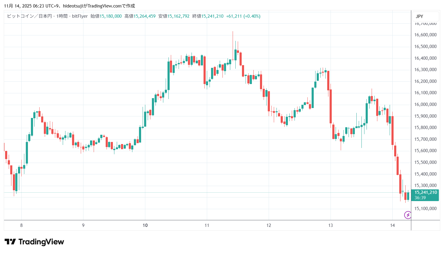11月14日のビットコインは、始値15,900,400円で寄りついた後、15,939,433円まで上昇したが、15,611,000円まで押し戻されて下落し、3時台には15,165,438円まで下落したが、15,233,887円まで買い戻されて上昇した。