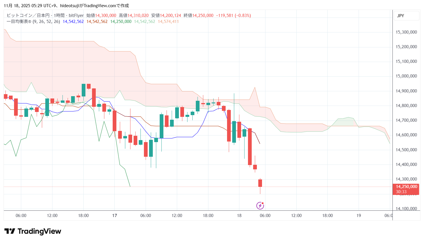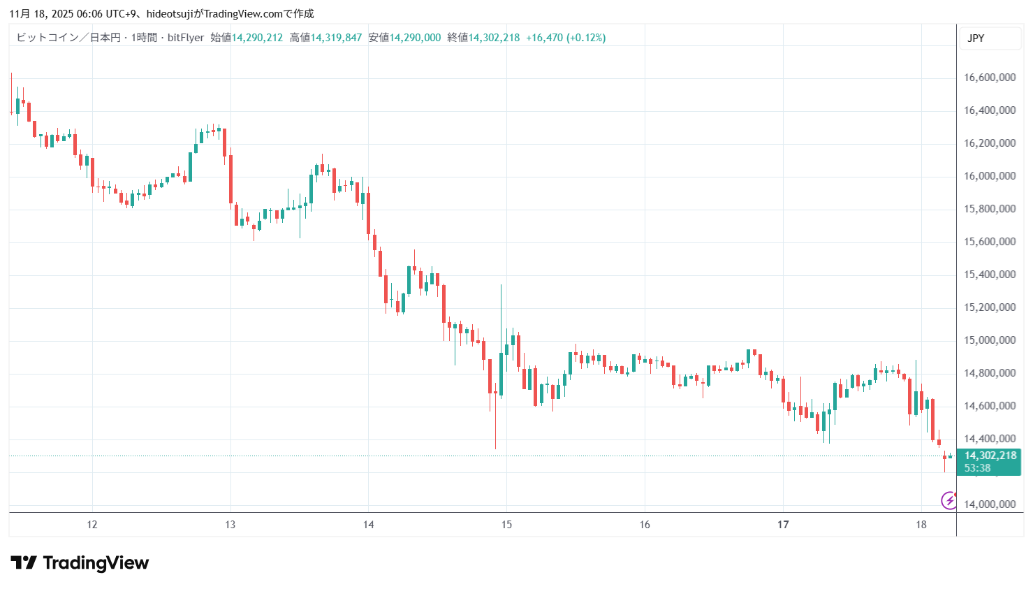 11月17日のビットコインは、終値ベースで、7日間連続マイナスの値動きとなった。8時台には最安値1437万円台まで下落したが、その後は上昇に転じ、23時台には最高値1488万円台まで上昇した。
