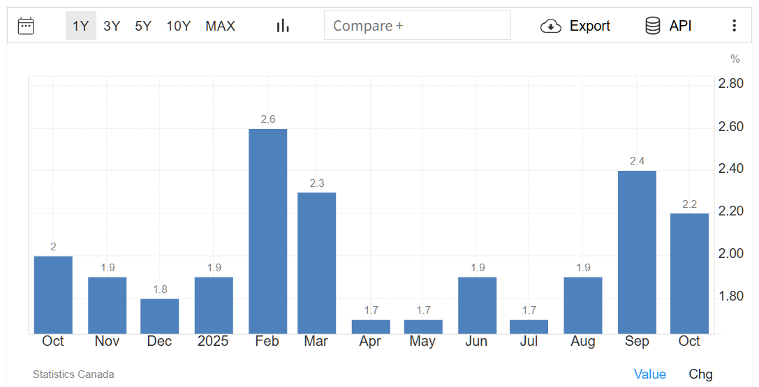 10月のカナダの消費者物価上昇率は前年同月比2.2%増