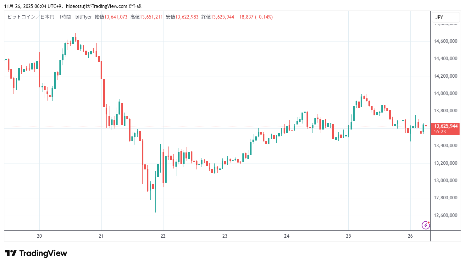 21時台には13,748,954円まで上昇したが、13,697,419円まで押し戻されて下落し、23時台には最安値13,440,001円まで下落したが、買い戻されて、23時59分59秒には終値13,554,659円をつけ、11月25日の取引を引けた。