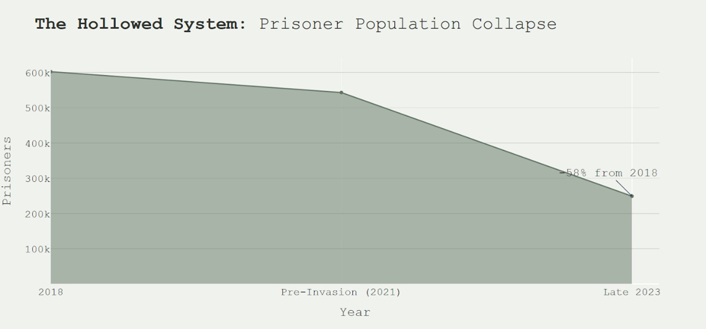 World Prison Briefのデータによると、ロシアは2018年に約60万2000人の囚人を収容していた。SWPの報道によると、2023年末までにこの数は約24万9000人という過去最低水準にまで急減した。
