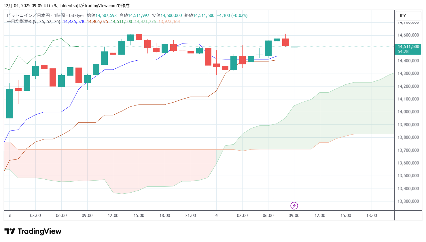 8時台には14,514,744円まで下落したが、14,515,600円まで買い戻された。9時台には始値14,507,593円で寄りついた後、上昇している。
