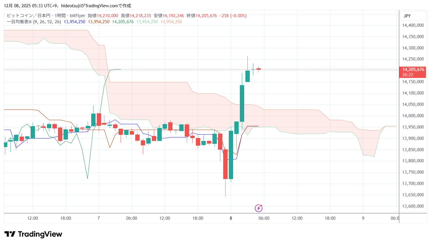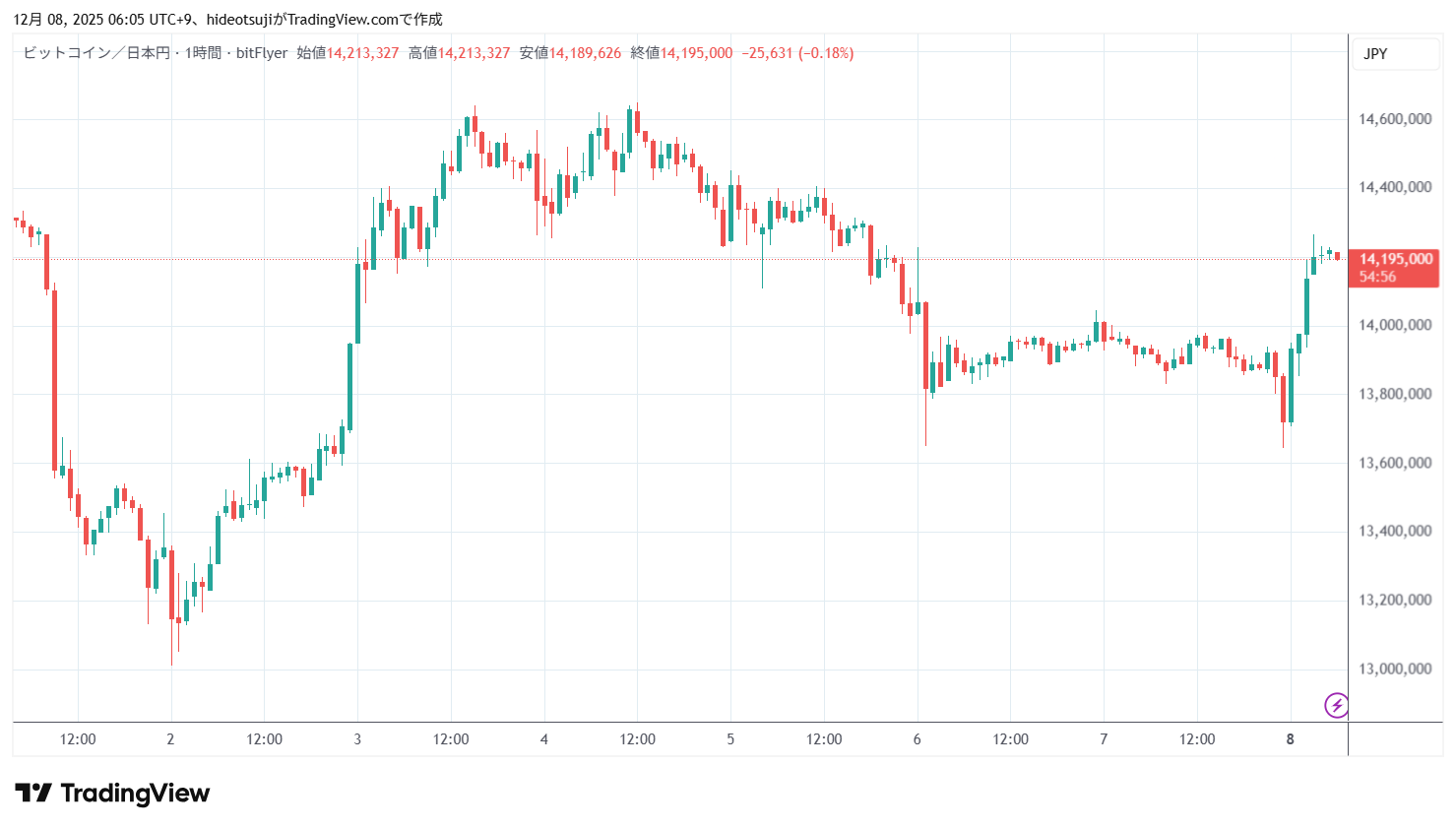 12月8日のビットコインは、始値13,721,962円で寄りついた後、13,707,183円まで下落したが、13,934,477円まで買い戻されて上昇し、3時台には14,264,999円まで上昇したが、14,200,465円まで押し戻された。