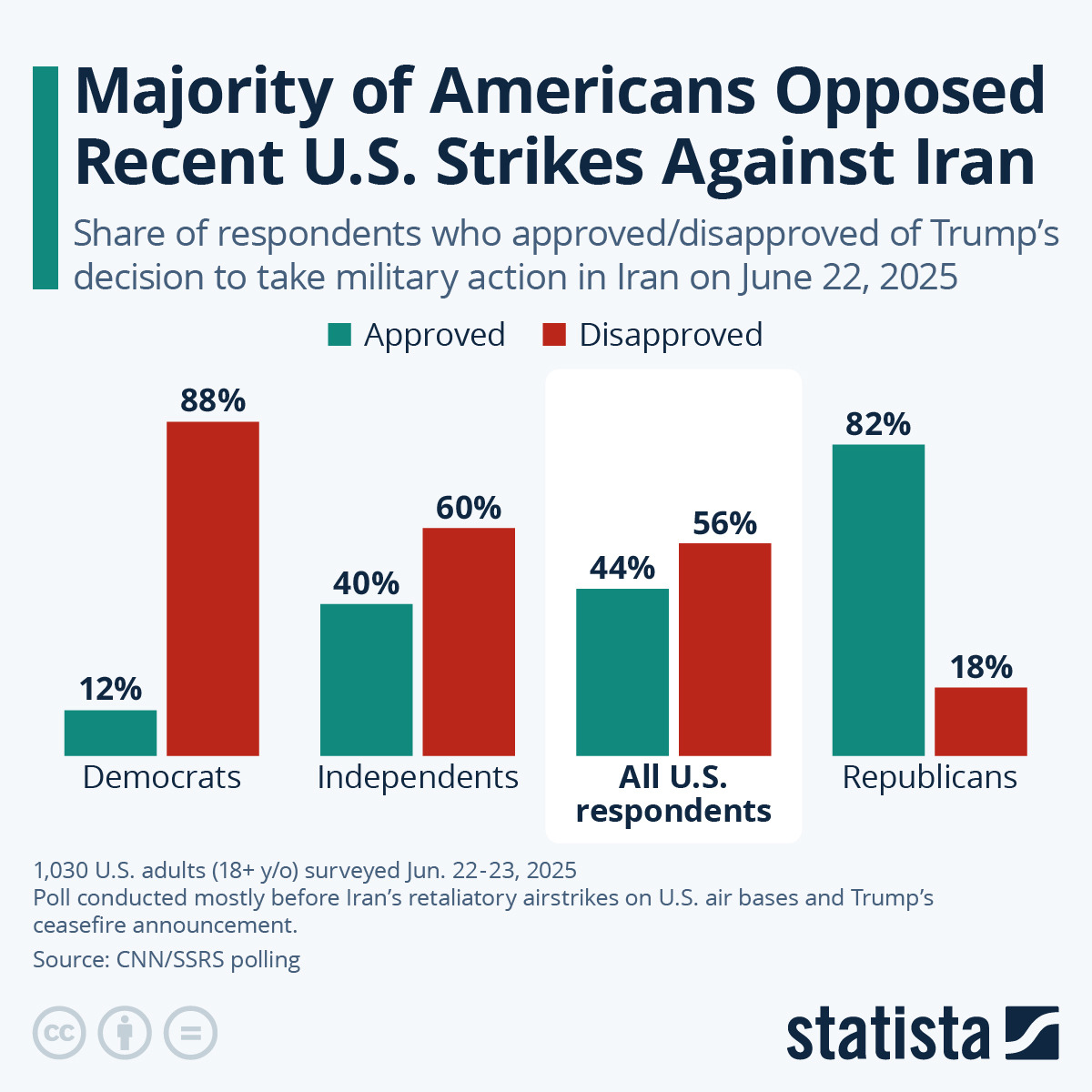 2025年6月22日~23日(イランの報復とトランプ大統領の停戦発表前)に実施されたCNNの世論調査では、アメリカ人の過半数(56%)がトランプ大統領の攻撃決定に反対していることが明らかになった。