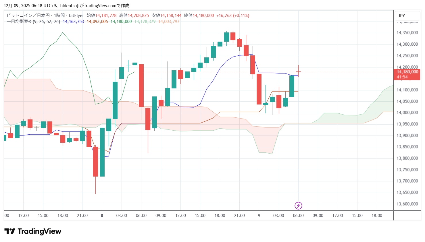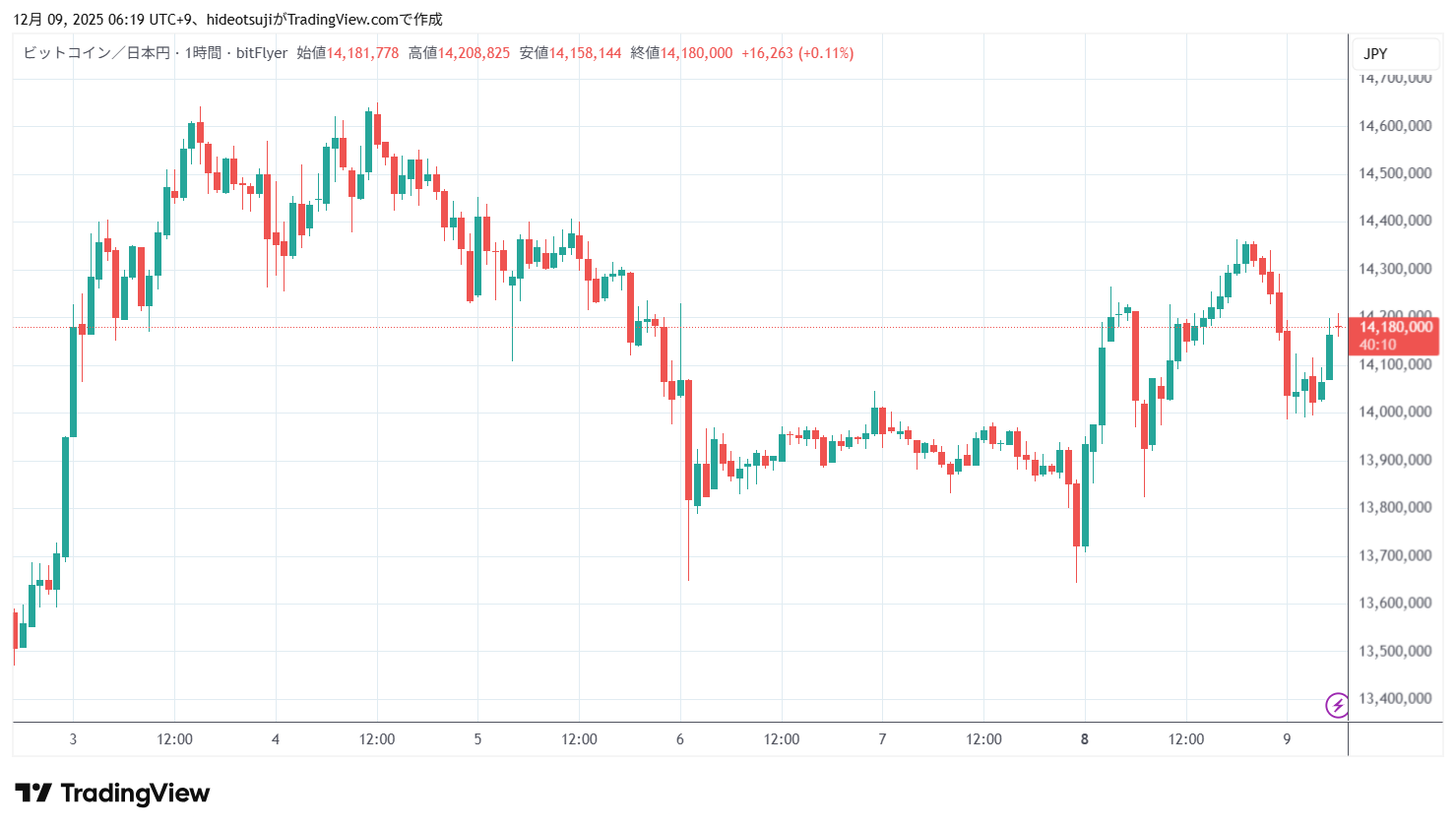 12月9日のビットコインは、始値14,171,197円で寄りついた後、14,194,734円まで上昇したが、13,986,707円まで下落した。その後、14,037,348円まで買い戻されて上昇し、1時台には14,123,901円まで上昇したが、14,044,315円まで押し戻されて下落した。