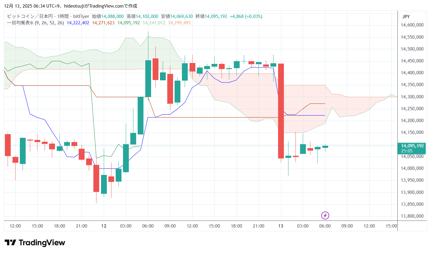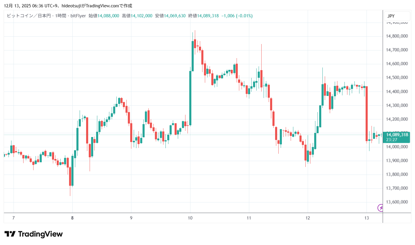 12月13日のビットコインは、始値14,439,037円で寄りついた後下落し、1時台には13,969,003円まで下落したが、14,053,699円まで買い戻されて上昇し、2時台には14,152,682円まで上昇したが、14,050,000円まで押し戻された。