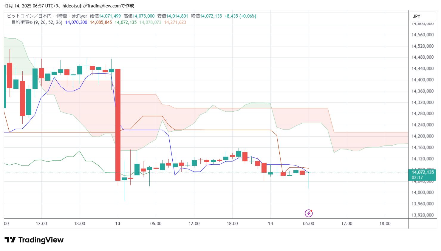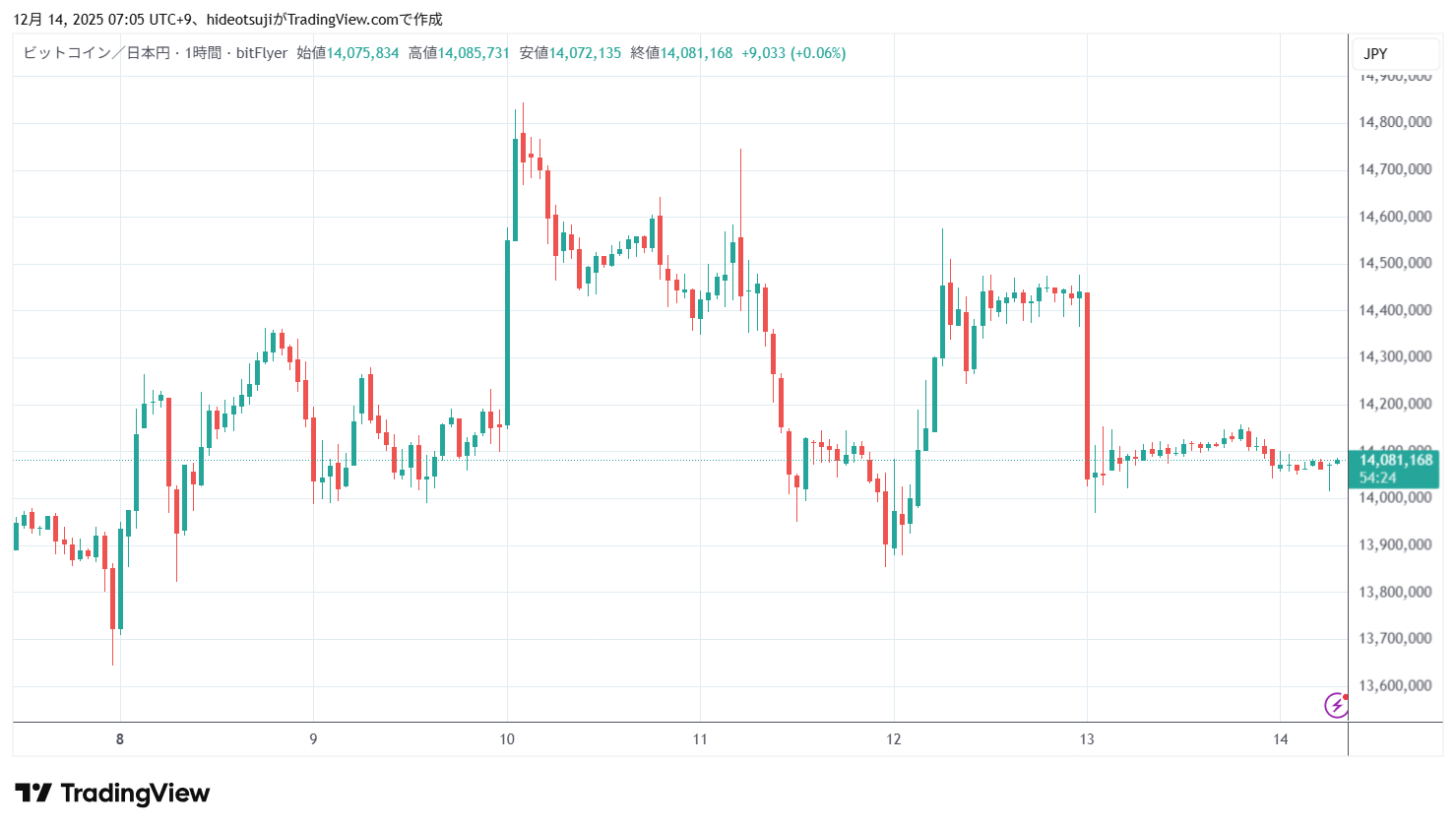 12月14日のビットコインは、始値14,065,499円で寄りついた後、14,056,139円まで下落したが、14,099,998円まで上昇した。その後、14,071,884円まで押し戻されて下落し、2時台には14,050,000円まで下落したが、14,060,663円まで買い戻されて上昇した。