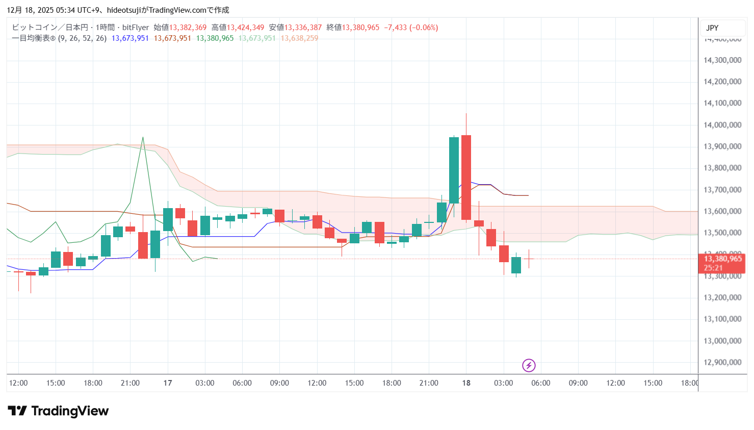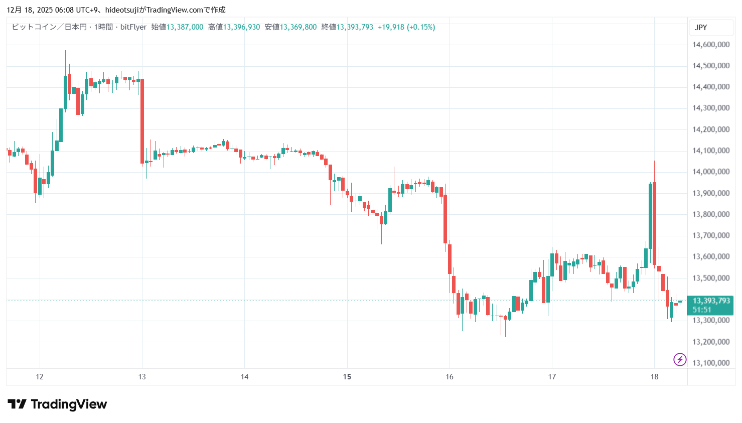 12月18日のビットコインは、始値13,953,500円で寄りついた後、14,055,000円まで上昇したが、13,563,677円まで押し戻されて下落し、4時台には13,292,902円まで下落したが、13,388,398円まで買い戻されて上昇した。