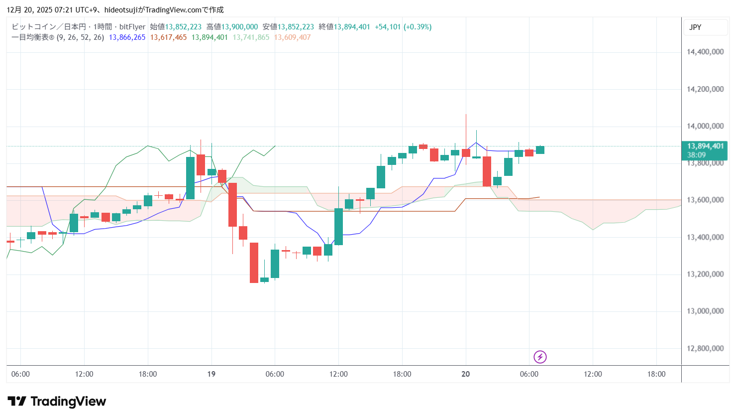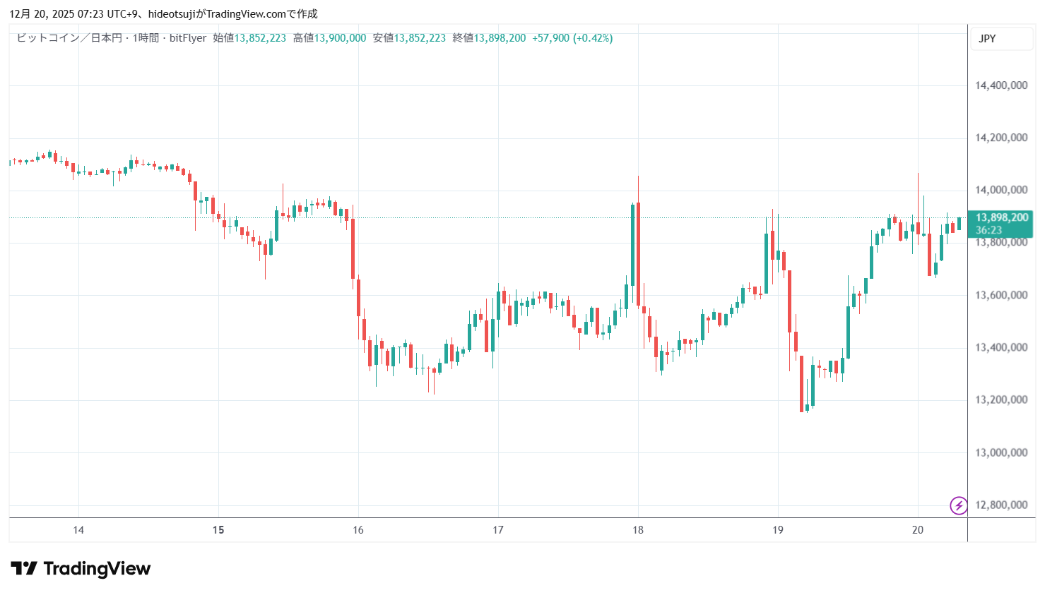 12月20日のビットコインは、始値13,877,051円で寄りついた後、14,067,330円まで上昇したが、13,791,601円まで下落した。その後、13,836,022円まで買い戻されて上昇し、1時台には13,980,597円まで上昇したが、13,836,403円まで押し戻されて下落した。