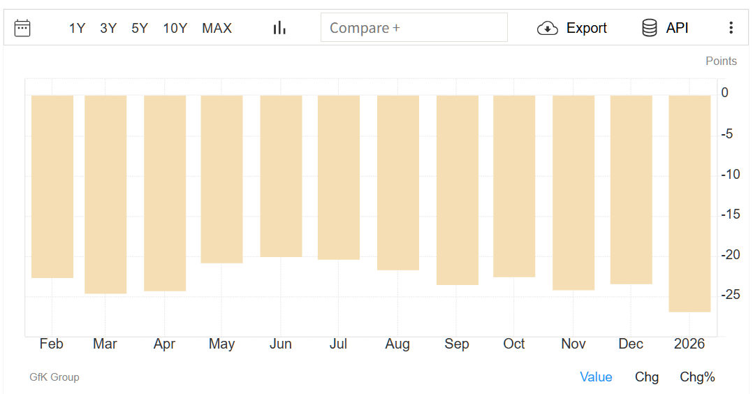 トルコの12月の消費者信頼感指数は、前月の85から83.5に低下した。これは7月以来の最低値であり、世帯の現在の家計状況の評価は69.6から67.9に低下し、今後12カ月間の家計見通しも85.7から85.2にわずかに低下した。