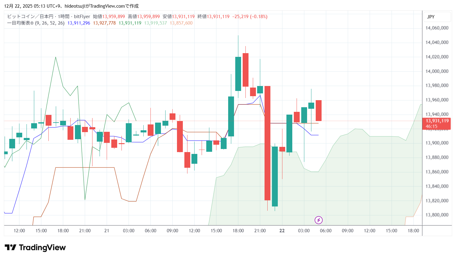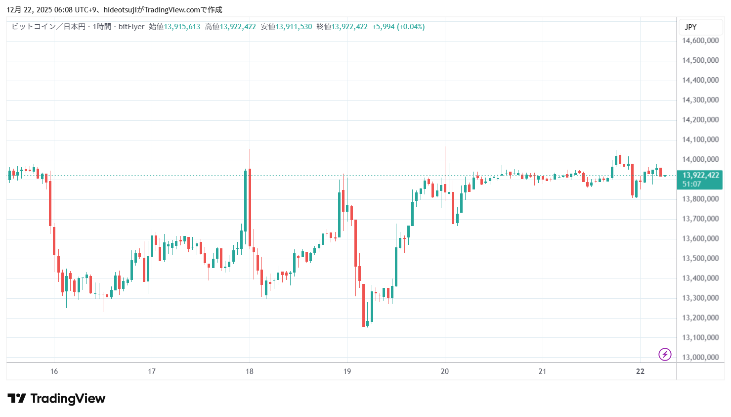 12月22日のビットコインは、始値13,894,755円で寄りついた後、13,850,001円まで下落したが、13,889,145円まで買い戻されて上昇し、2時台には13,962,626円まで上昇したが、13,929,702円まで押し戻されて下落した。