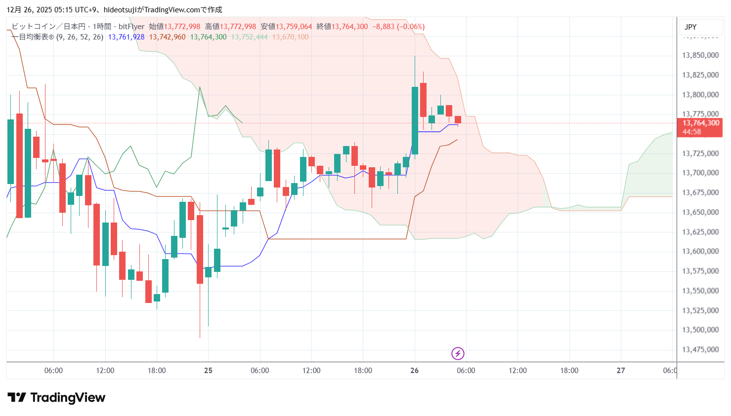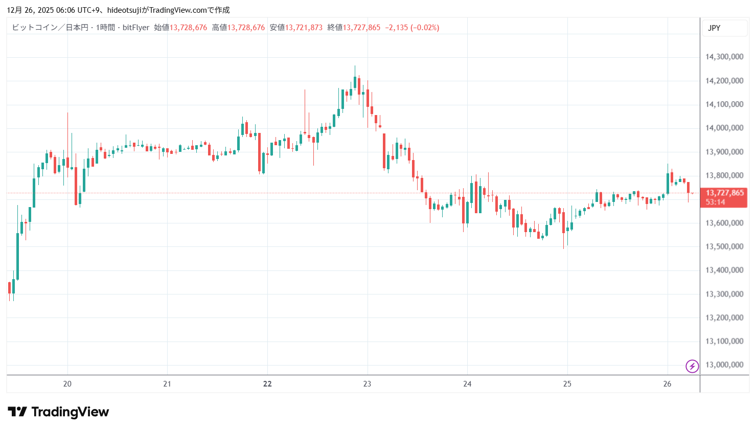12月26日のビットコインは、始値13,724,800円で寄りついた後、13,717,756円まで下落したが、13,850,000円まで上昇した。その後、13,810,180円まで押し戻された。1時台には13,829,456円まで上昇したが、13,755,155円まで下落した。