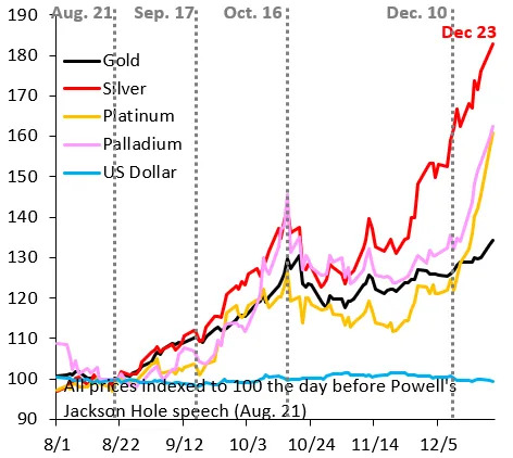 最も強力な表現を貴金属市場で見せているのは示唆的であり、下のチャートが示す通り、すべての貴金属が熱狂的に動いている。この安全資産への逃避は、市場が世界の政策立案者に対する信頼を失ったことを示しており、責めることは難しい状況である。