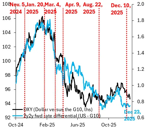 データ減速への予想が市場の比較的抑制された反応を説明していると考えられ、10年物国債利回りは当日わずか3bps上昇に留まり、2026年のフェッド・ファンド金利引き下げ予想は依然50bp超で推移している。