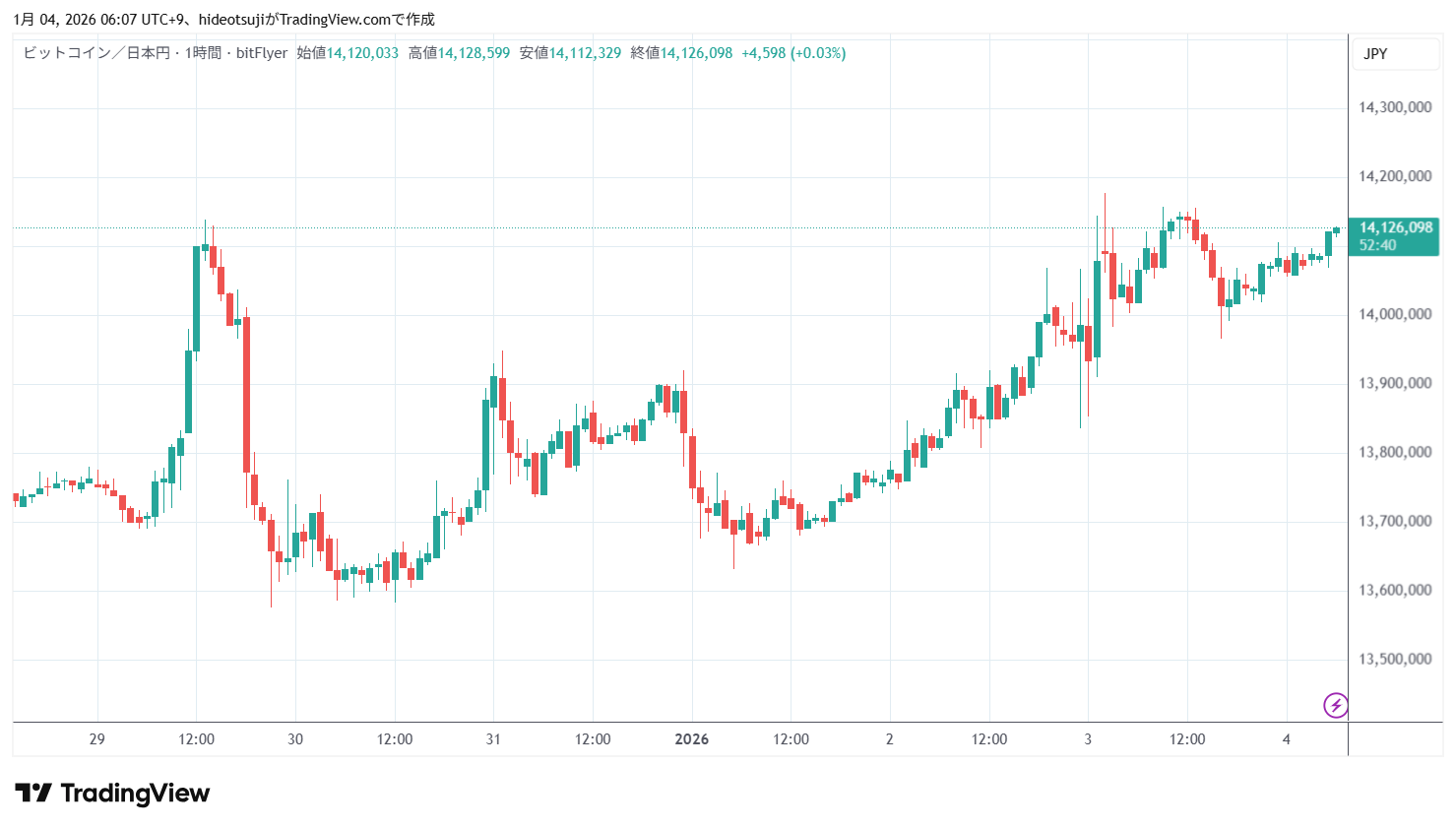 1月4日のビットコインは、始値14,080,000円で寄りついた後、14,055,120円まで下落したが、14,062,000円まで買い戻されて上昇し、1時台には14,097,922円まで上昇したが、14,088,874円まで押し戻されて下落した。