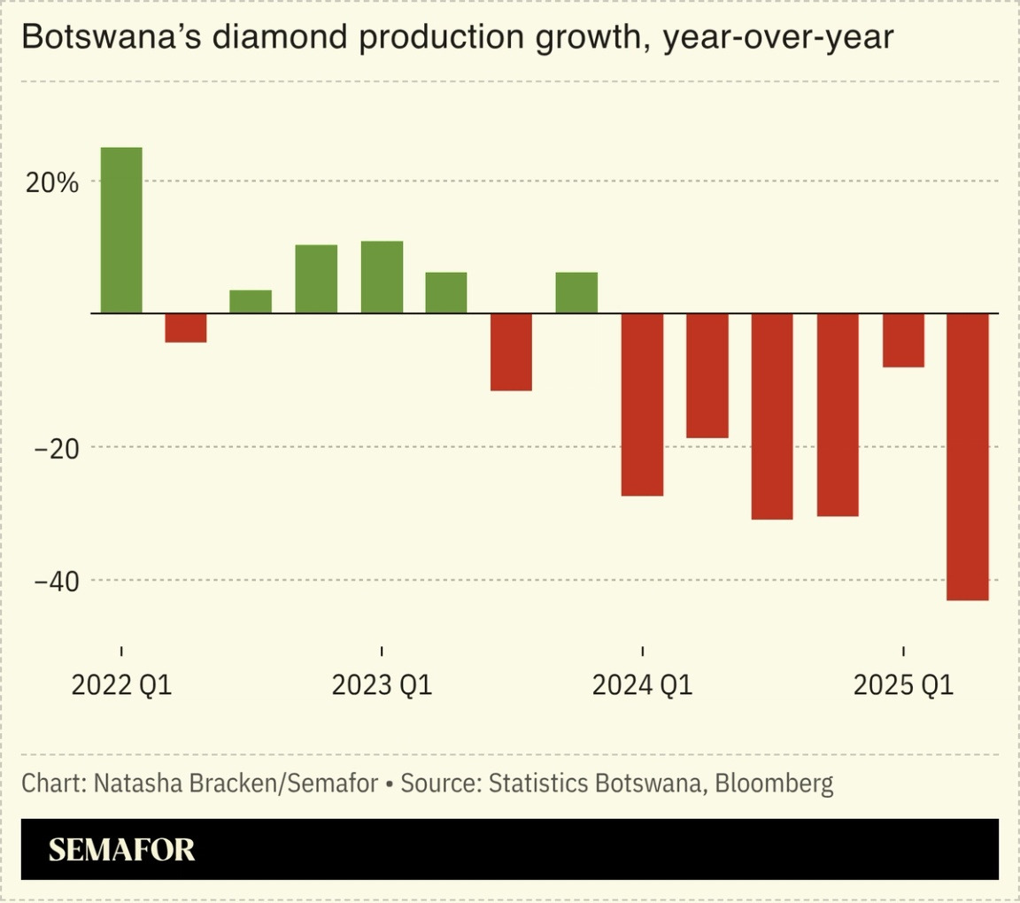 ダイヤモンドはボツワナ収入の3分の1を占め、同国をアフリカ有数の富裕国に押し上げた。しかし人工ダイヤモンドの台頭により、天然石の価値は下落している。