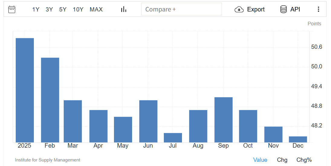 米国のISM製造業PMIは、2025年12月に47.9と3カ月連続で低下し、2024年10月以来の低水準となった。前月の48.2および予想値48.3を下回る結果である。