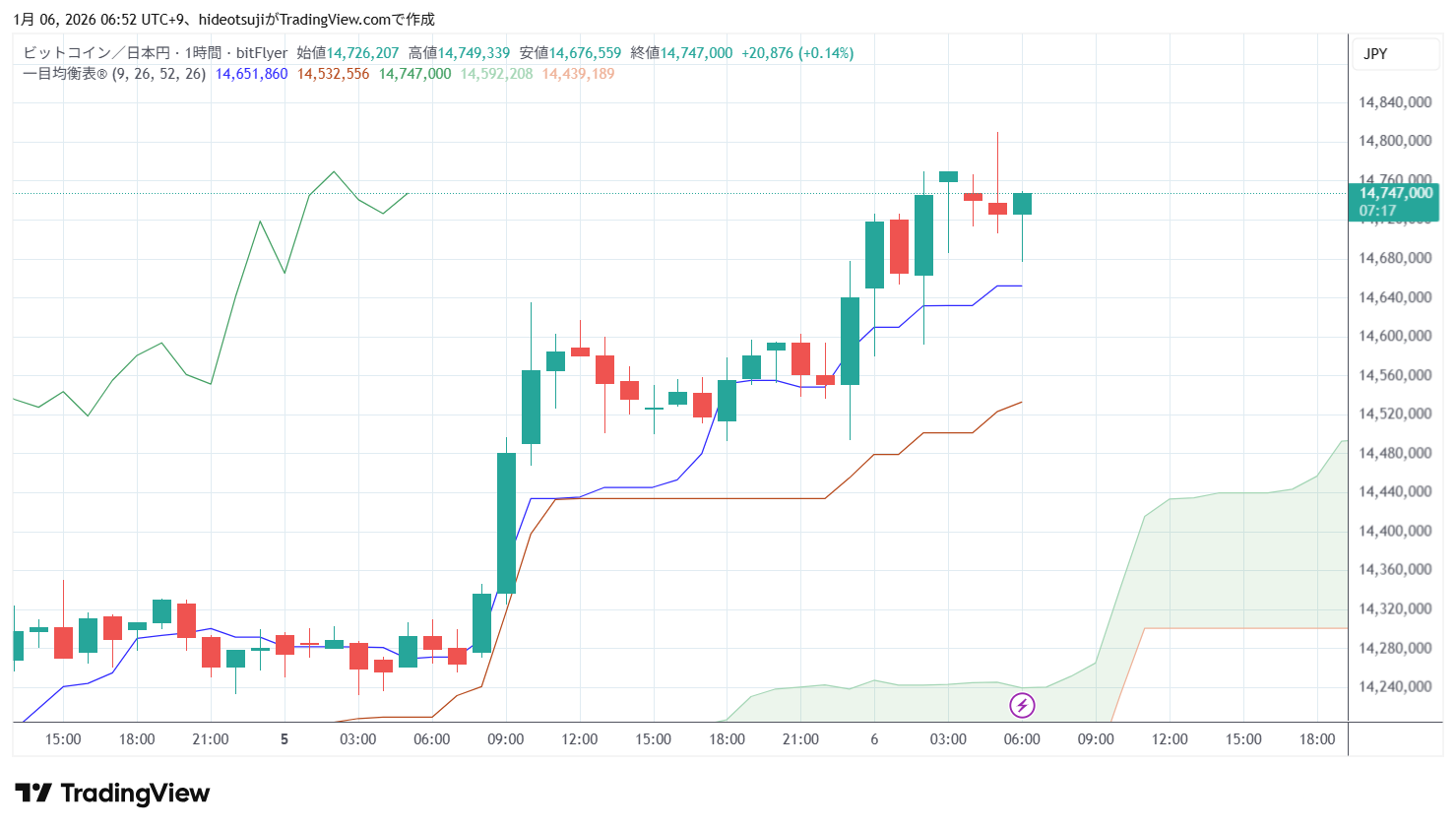 1月6日のビットコインは、始値14,649,997円で寄りついた後、14,579,127円まで下落したが、14,718,400円まで買い戻されて上昇し、3時台には14,770,000円まで上昇したが、14,769,392円まで押し戻されて下落した。