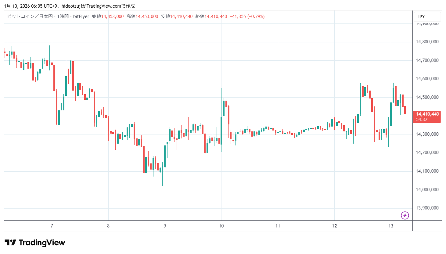 1月13日のビットコインは、始値14,347,533円で寄りついた後、14,318,492円まで下落したが、14,472,000円まで買い戻されて上昇し、2時台には14,580,000円まで上昇したが、14,385,661円まで下落した。その後、14,455,321円まで買い戻されて上昇した。