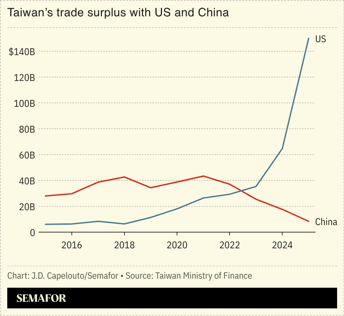 新しいデータによると、2025 年の台湾の米国向け輸出は、AI による需要に牽引され、26 年ぶりに中国向け輸出を上回った。ウォール・ストリート・ジャーナル紙によると、台湾の対米貿易黒字は昨年 1,500 億米ドルに達し、2024 年の2倍以上に増加した。