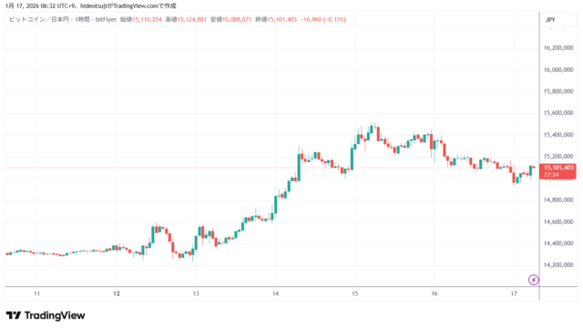 1月16日のビットコインは、終値ベースで、2日間連続マイナスの値動きとなった。2時台には最高値1539万円台まで上昇したが、その後は伸びを欠いて押し戻され、終値は150万円台をつけ、取引を引けた。
