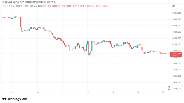 1月24日のビットコインは、終値ベースで、7日間連続マイナスの値動きとなった。2時台には最高値1429万円台まで上昇したが、その後は伸びを欠いて押し戻され、終値は1394万円台をつけ、取引を引けた。
