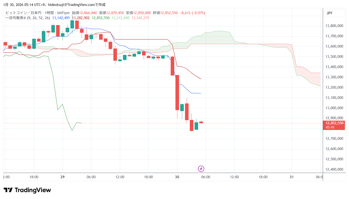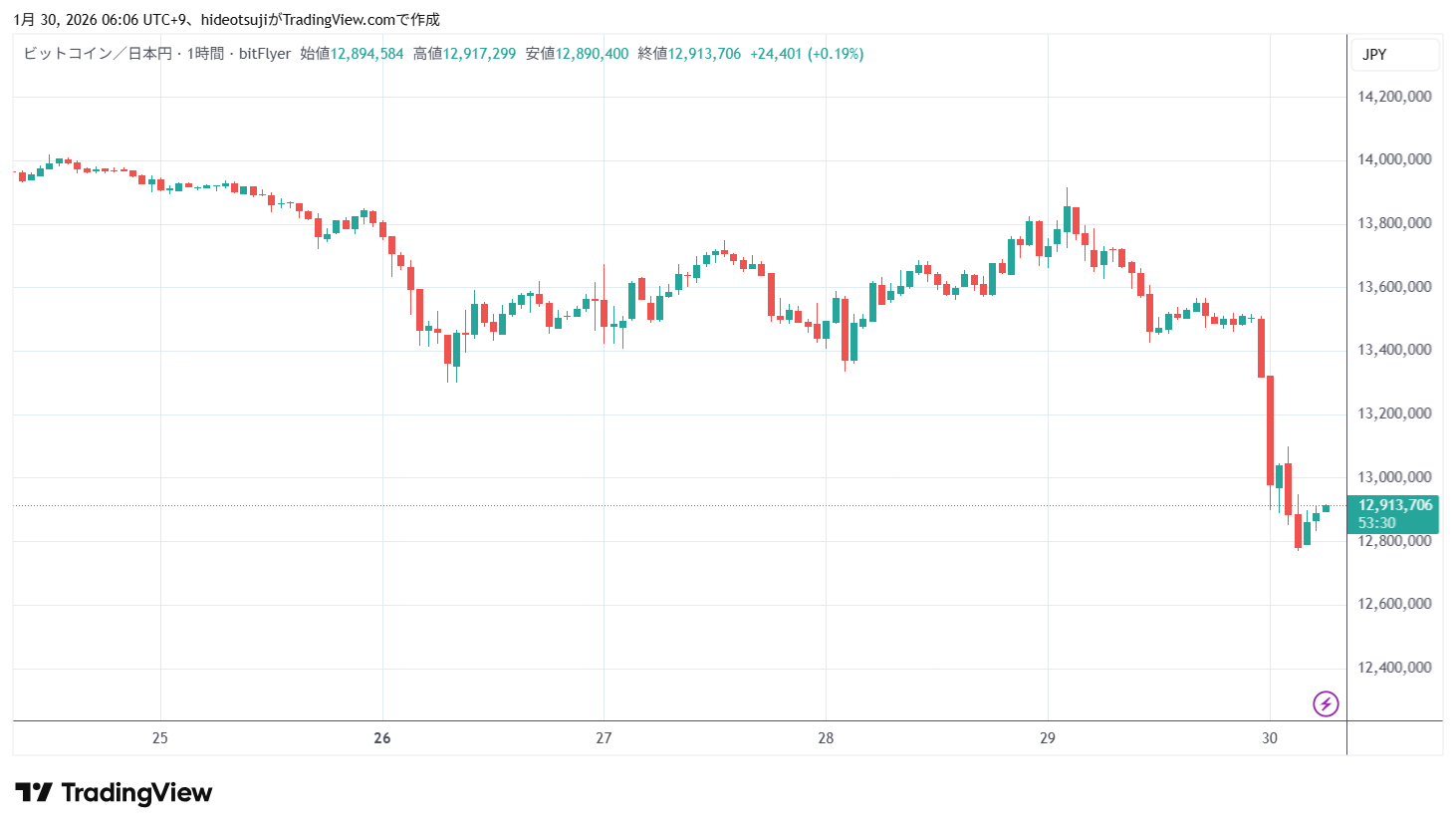 1月30日のビットコインは、始値13,320,703円で寄りついた後、13,322,651円まで上昇したが、12,981,012円まで押し戻されて下落し、1時台には12,890,000円まで下落したが、13,037,741円まで買い戻されて上昇した。