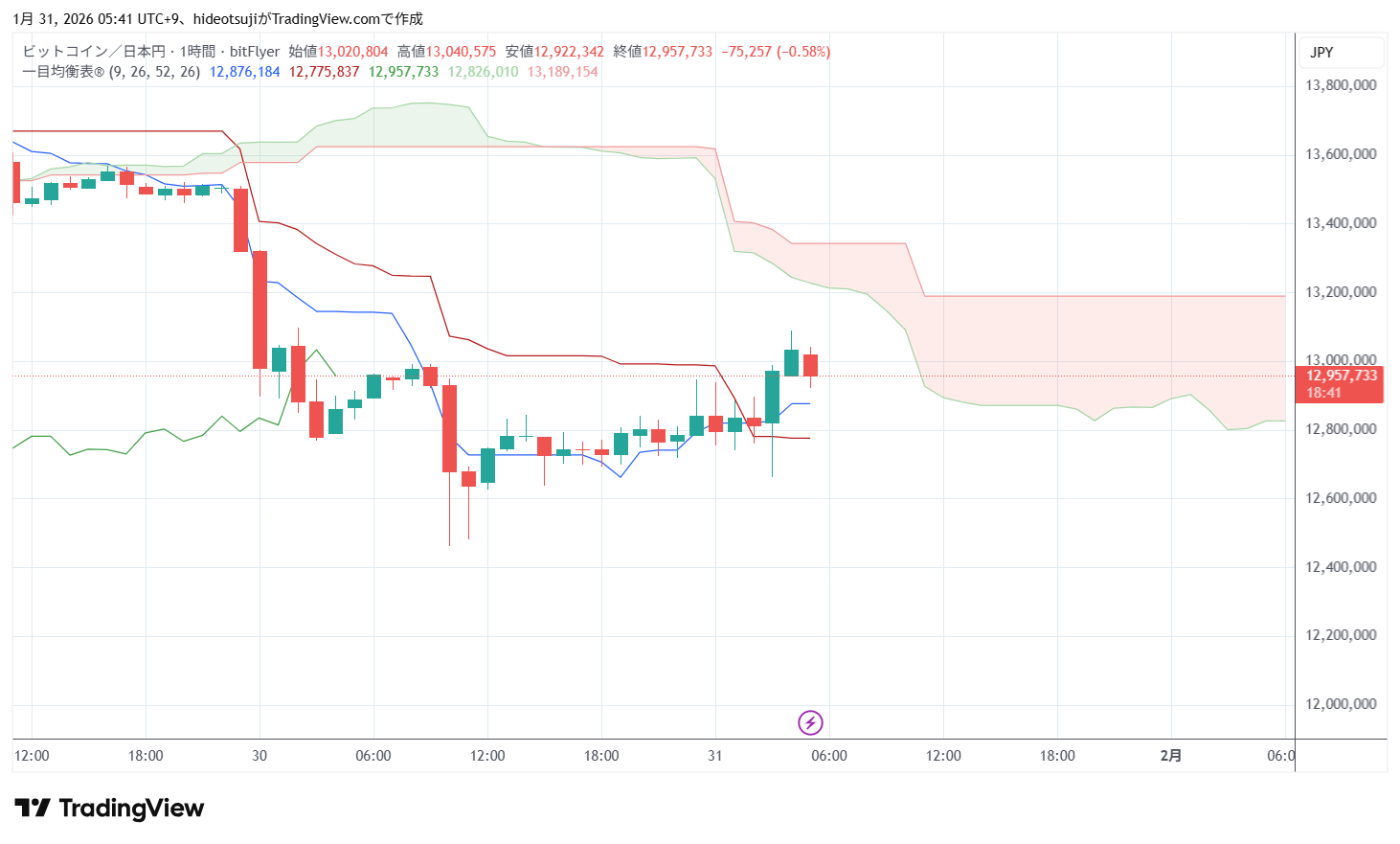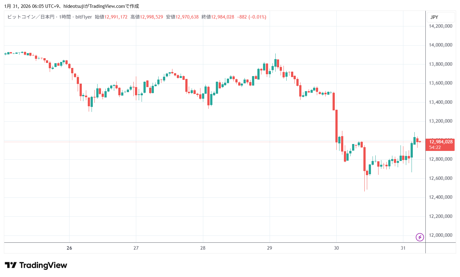 1月31日のビットコインは、始値12,937,751円で寄りついた後、12,775,666円まで下落したが、12,937,751円まで上昇した。その後、12,795,428円まで押し戻されて下落し、1時台には12,741,068円まで下落したが、12,834,636円まで買い戻されて上昇した。