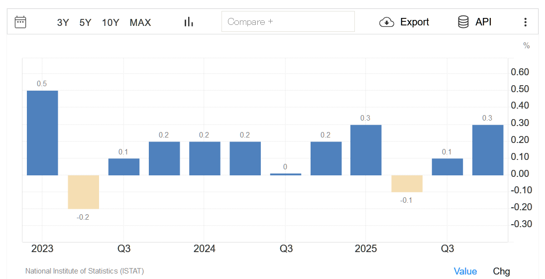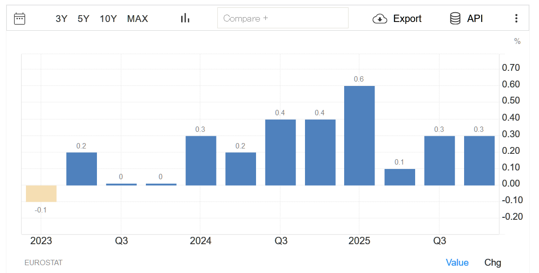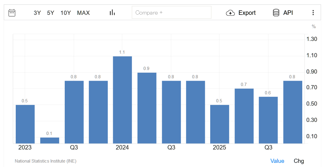 スペインの国内総生産は、2025年第4四半期に前期比0.8%増と力強い成長を記録し、1年ぶりの高い成長率を記録した。予備的な推計によると、前四半期の0.6%から加速している。この結果は、より緩やかな同0.6%の成長率を予想していた市場予想も上回った。