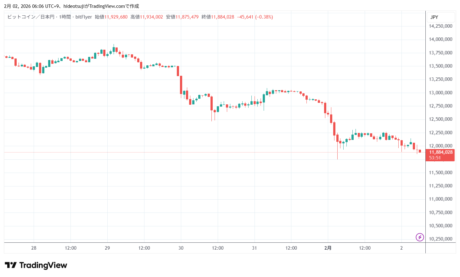 2月1日のビットコインは、終値ベースで、4日間連続マイナスの値動きとなった。1時台には最高値1272万円台まで上昇したが、その後は伸びを欠いて押し戻され、終値は1211万円台をつけ、取引を引けた。