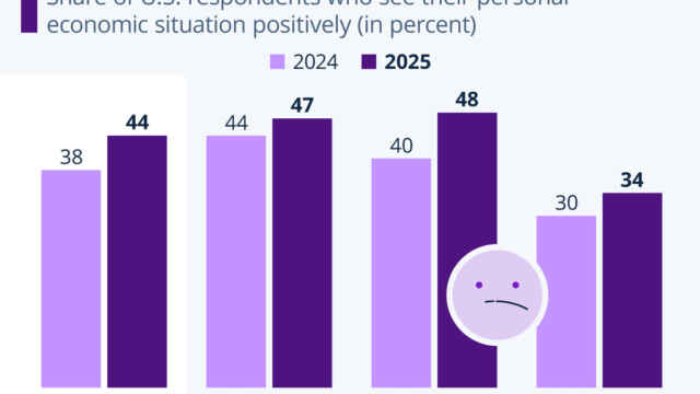 18~49歳の回答者はこの点でより楽観的で、47~48%が自身の財政状況を肯定的に評価しているのに対し、50~64歳ではこの数値は34%に低下する。それ以上の年齢層は調査対象に含まれていなかった。財政状況への満足度が低い