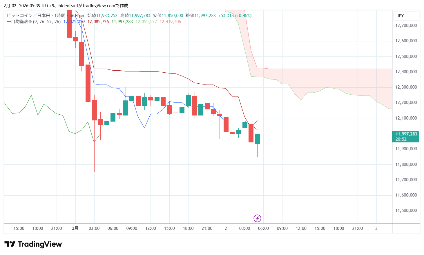 2月2日のビットコインは、始値12,110,000円で寄りついた後、12,115,000円まで上昇したが、11,892,869円まで下落した。その後、12,014,033円まで買い戻された。1時台には11,935,748円まで下落したが、12,000,000円まで買い戻されて上昇した。