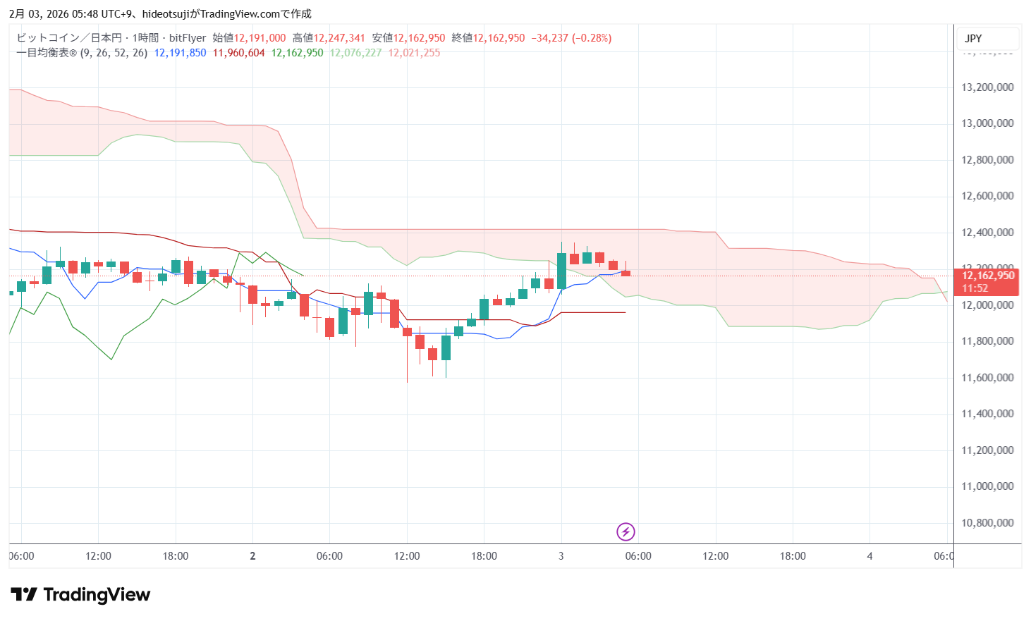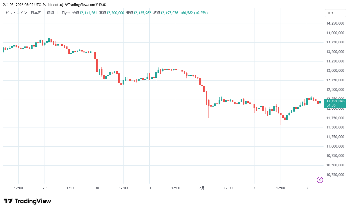 2月3日のビットコインは、始値12,095,853円で寄りついた後、12,060,777円まで下落したが、12,348,699円まで上昇した。その後、12,288,711円まで押し戻されて下落し、1時台には12,229,403円まで下落したが、12,231,981円まで買い戻されて上昇した。