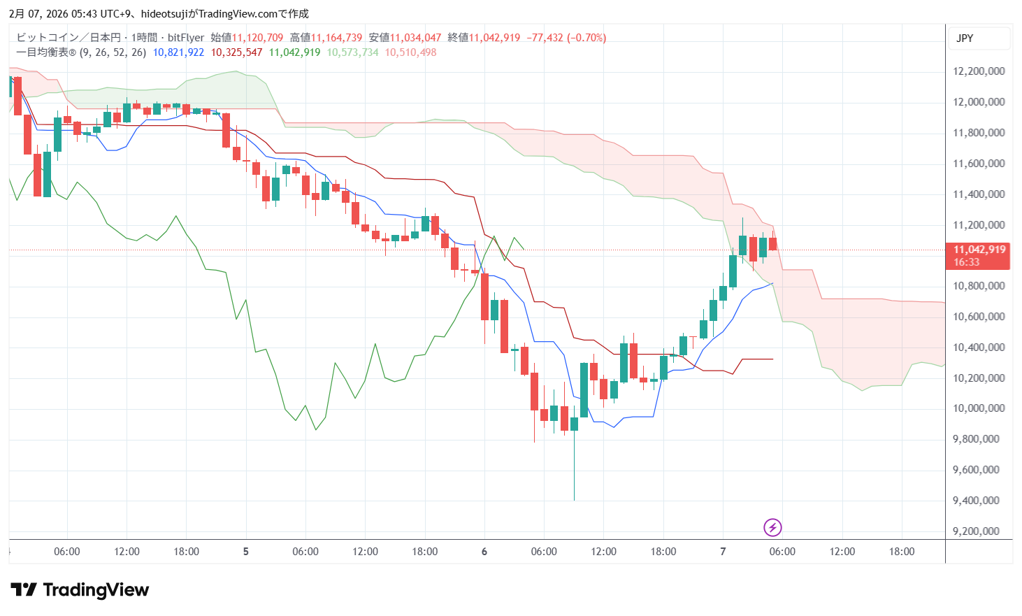 2月7日のビットコインは、始値10,711,203円で寄りついた後、10,655,000円まで下落したが、10,802,878円まで買い戻されて上昇し、2時台には11,250,093円まで上昇したが、11,130,451円まで押し戻されて下落した。